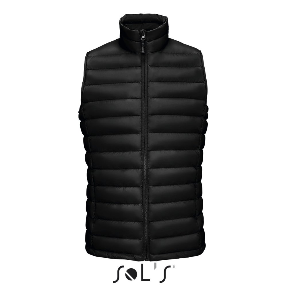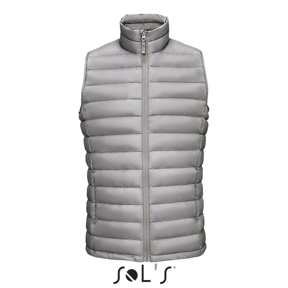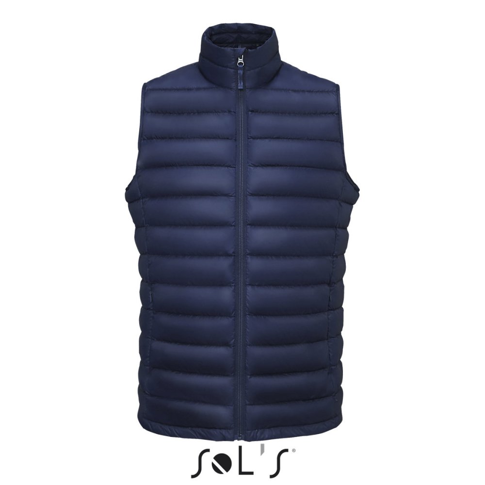 Мужской стеганый жилет облегающего кроя на молнии с небольшим воротником-стойкой. Два передних кармана на молнии, два внутренних кармана. Жилет компактно складывается в чехол-мешочек на шнурке со стопорами.