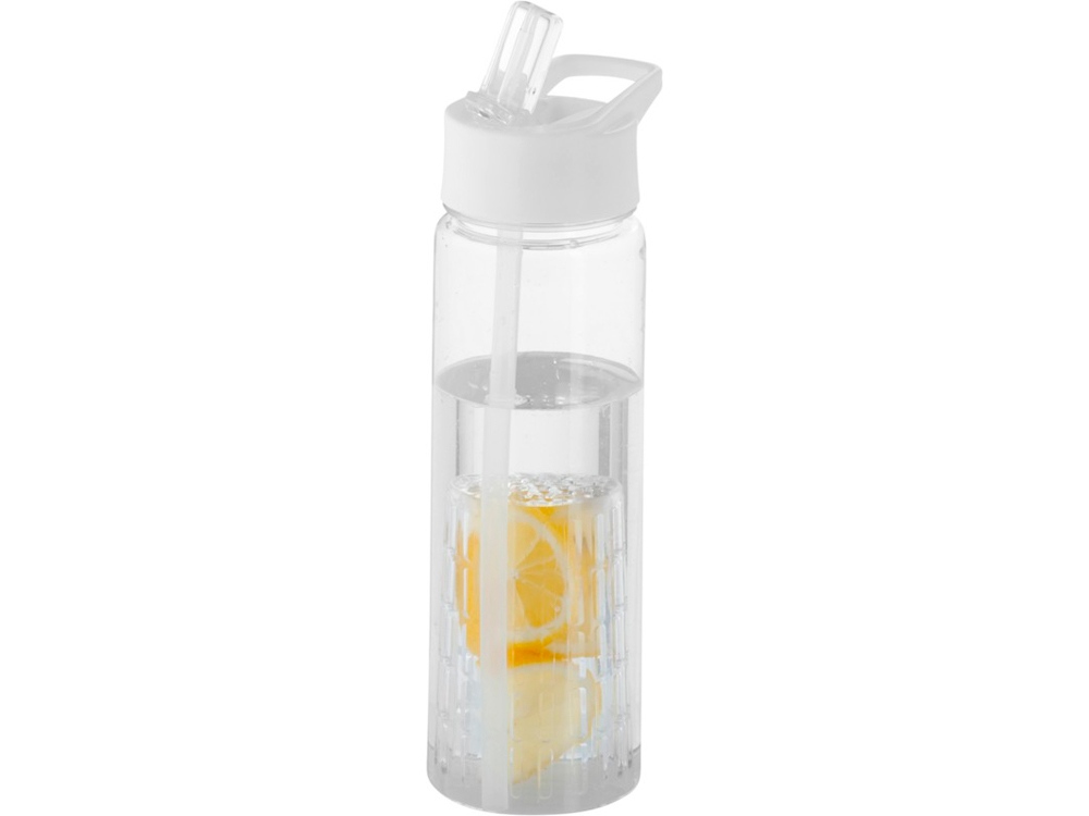 Оригинальная прозрачная бутылка для воды. Благодаря отделению для фруктов есть возможность создания лимонада на свой вкус. Придется по вкусу любителям натуральных продуктов и здорового образа жизни. Легко разбирается. На пластиковый корпус возможно нанесение тампопечати. Объем – 740 мл.