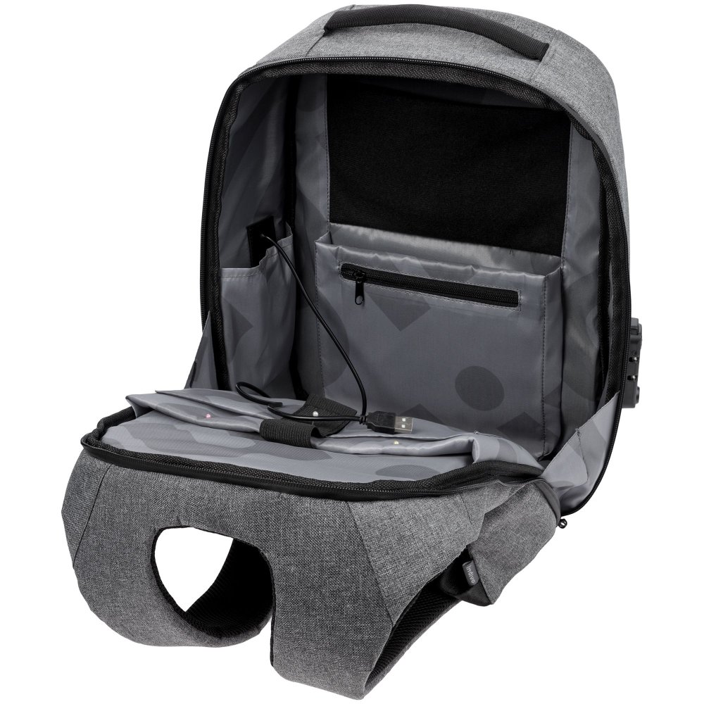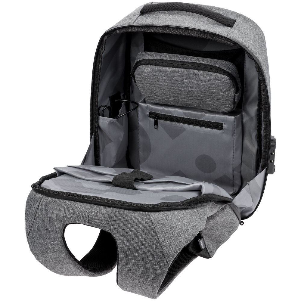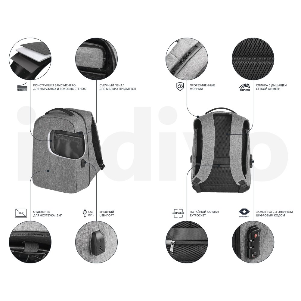 Конструкция наружных и боковых стенок рюкзака под названием sandwichPro состоит из четырех слоев: верхний Waterproof TEX не пропускает влагу, а остальные спасут от порезов. Смещенная к спинке молния центрального отделения осложняет нежелательный доступ к содержимому, а дополнительную безопасность гарантирует замок TSA с трехзначным цифровым кодом. Для удобства пользователя с левой стороны рюкзака размещен внешний USB-порт для зарядки гаджетов: аккумулятор можно положить во внутренний кармашек. 4-слойная конструкция стенок sandwichPro с защитой от порезов. Наружный материал Waterproof TEX с водоотталкивающей пропиткой. Замок TSA с 3-значным цифровым кодом. Внешний USB-порт для зарядки гаджетов (внутри рюкзака — провод для подключения и карман для размещения аккумулятора). Смещенная к спинке молния центрального отделения. Отделение для ноутбука. 2 внутренних кармана. Потайной карман extPocket на спинке рюкзака. Спинка с дышащей сеткой airMesh. Эргономичные регулируемые лямки. Прорезиненные молнии. Крепление для ручки чемодана. Усиленная ручка для переноски. В комплекте съемный пенал для мелких предметов.