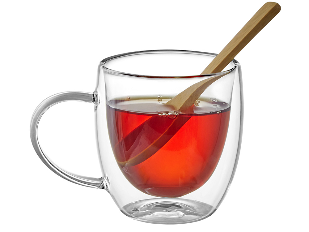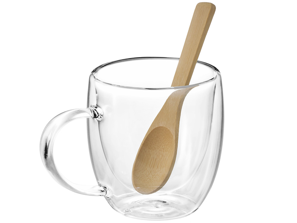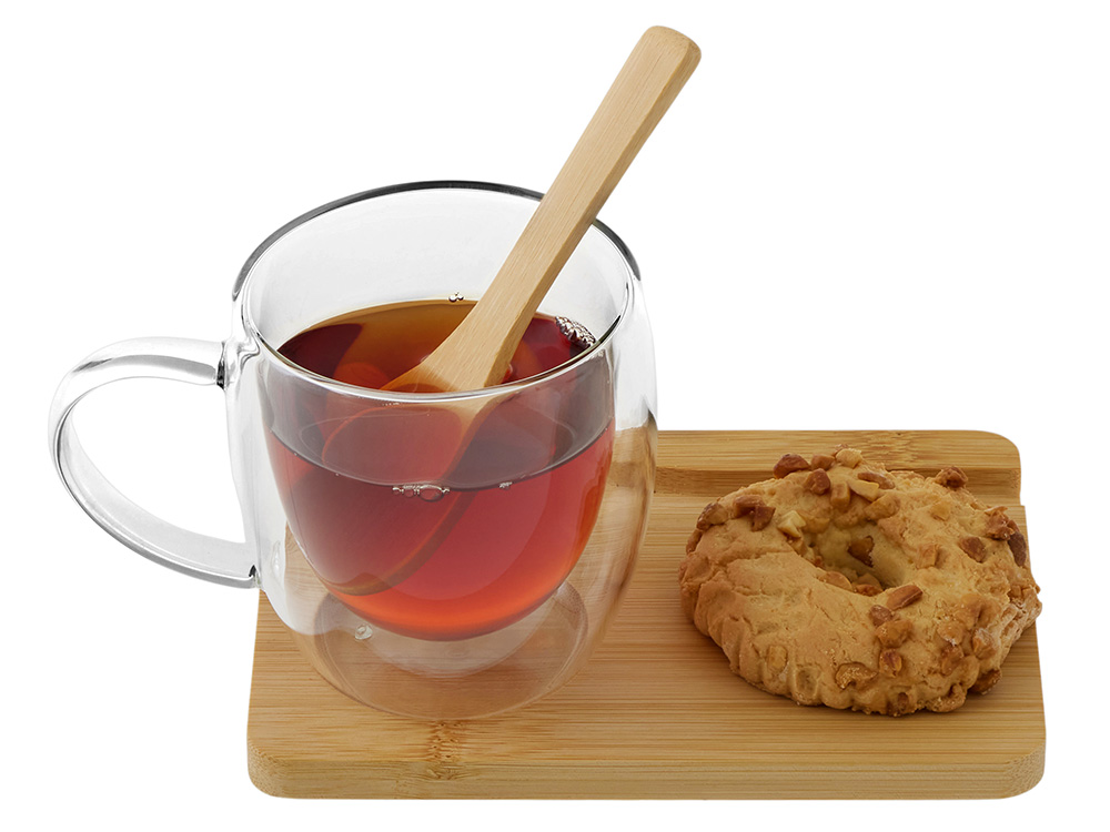 Набор "Teatrio" кружку из боросиликатного стекла объёмом 250 мл с ложечка 13 см и подставкой 16×11,3 см из натурального бамбука, обработанного пищевым маслом.