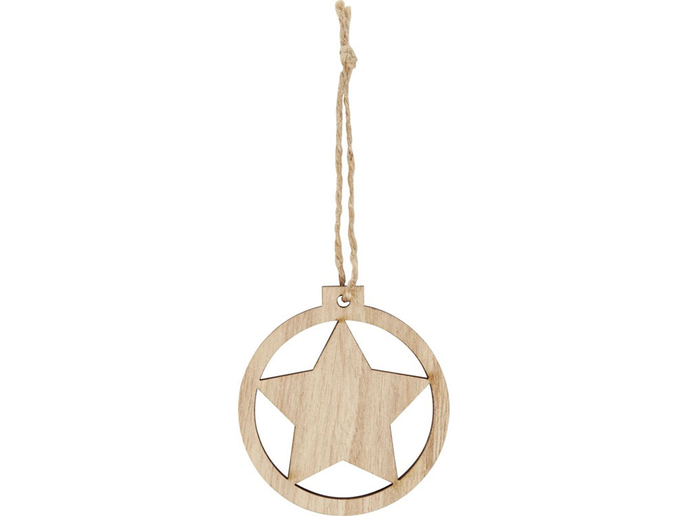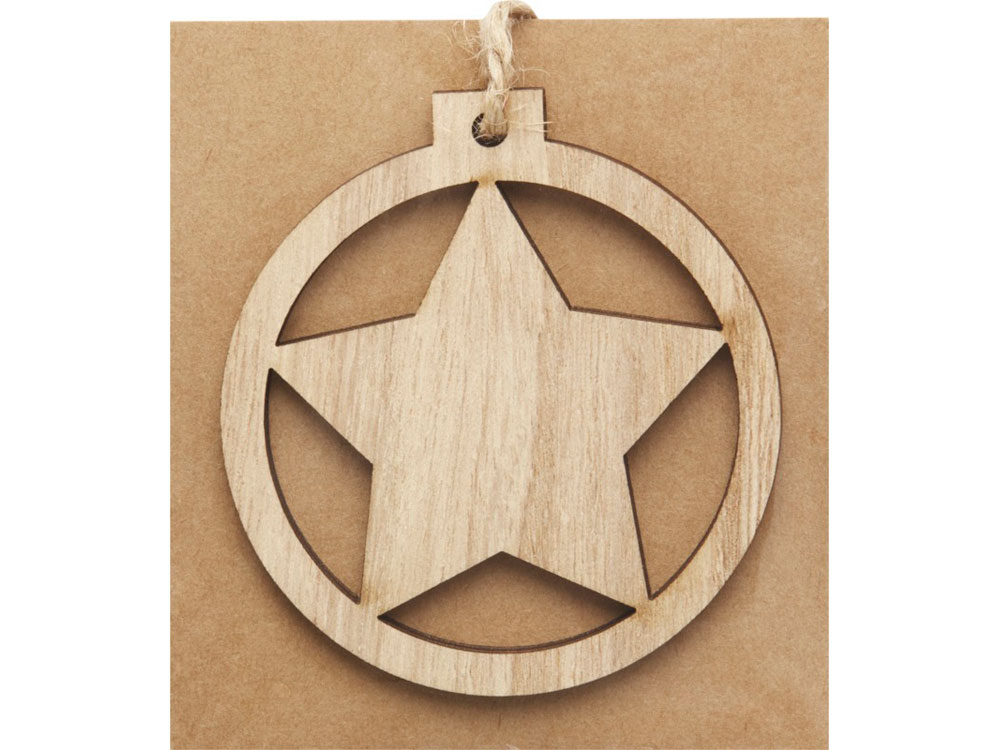 Деревянное украшение «Natall» со звездой внутри, с петлей и шнурком для подвешивания. Упаковано с открыткой из крафт-бумаги на обратной стороне.