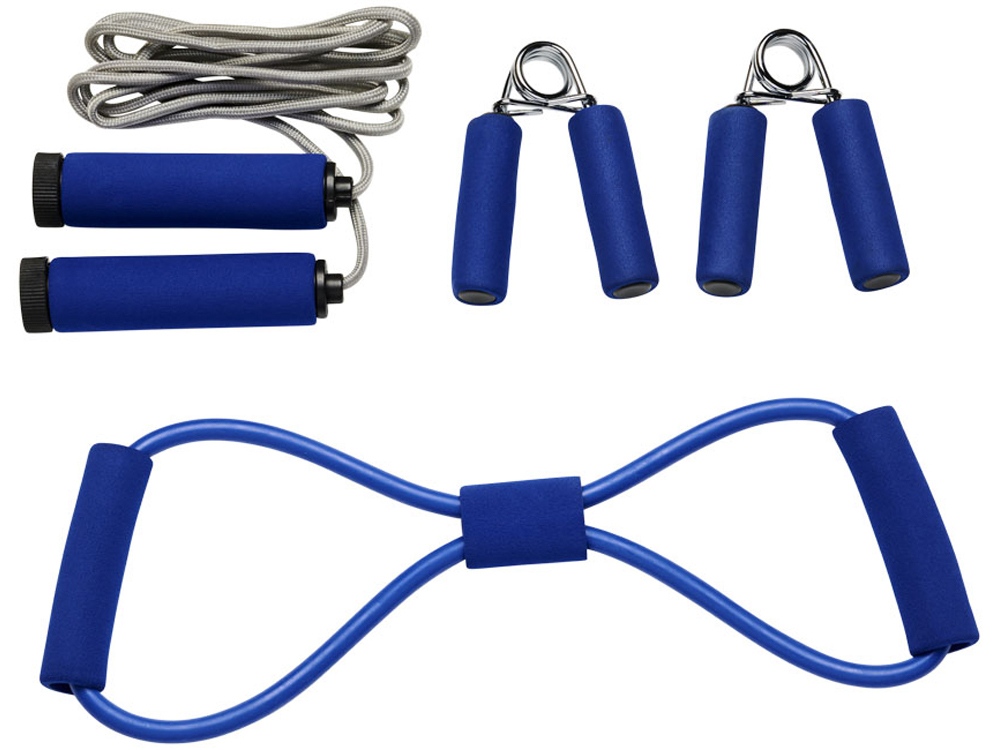 Набор для фитнеса Dwayne содержит весь спортивный инвентарь, необходимый для полноценной тренировки. Два кистевых эспандера, скакалка и грудной эспандер в соответствующем цветовом исполнении. Для удобной переноски поставляется в сетчатом мешочке, на котором можно сделать нанесение. Полиэстер.