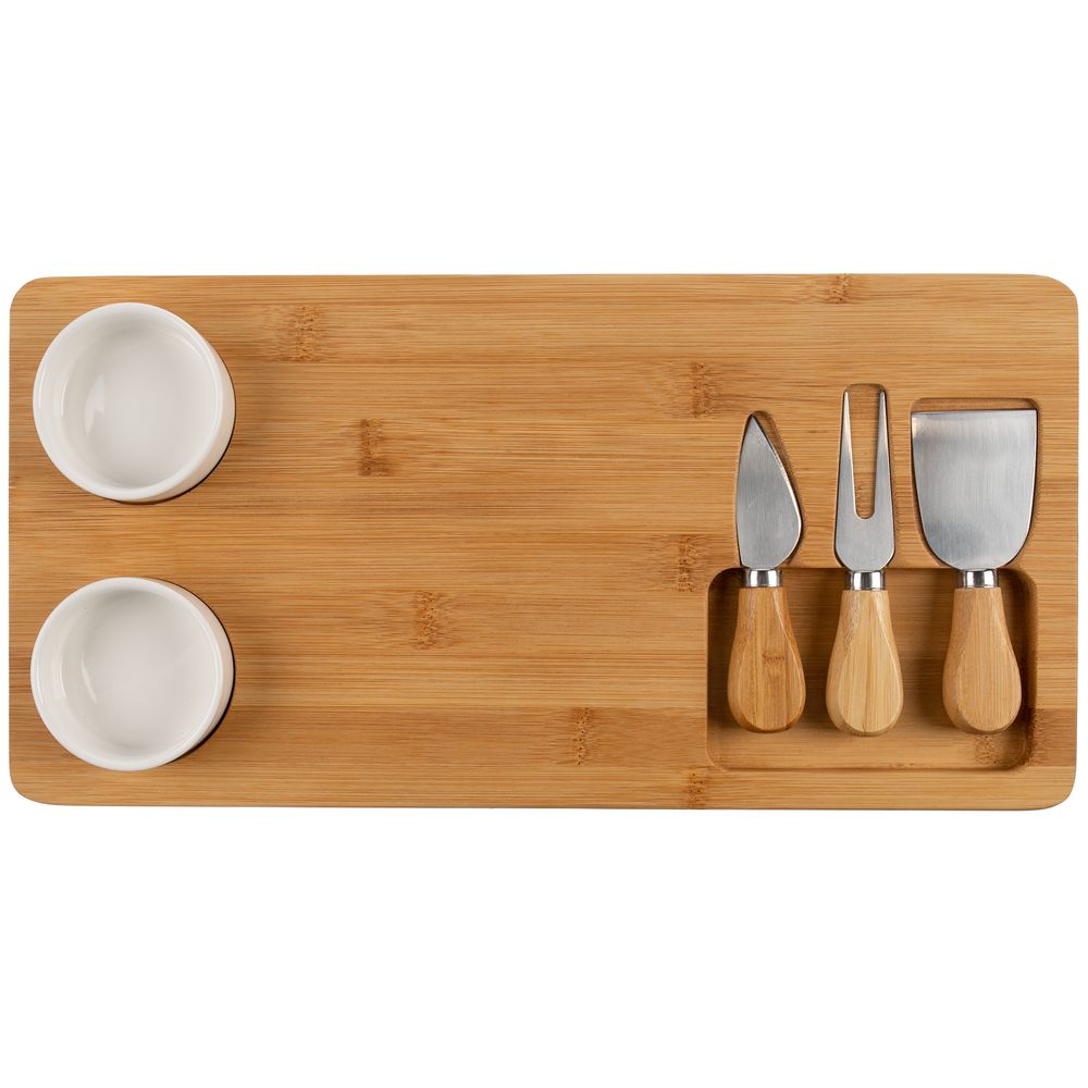 Стильное лаконичное решение для изящной сервировки сырной тарелки.В набор входят доска из бамбука, два керамических соусника, вилка, листовидный нож для сыра твердых сортов, нож-лопатка для мягкого сыра.Емкость соусника 70 мл.Набор поставляется в индивидуальной транспортной упаковке.