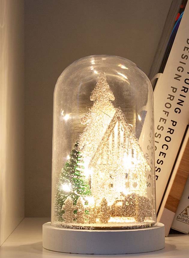 Внутри миниатюрная гирлянда с 10 лампочками с теплым белым светом.