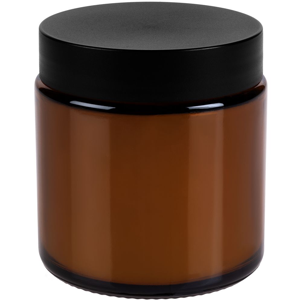 Свеча Calore с приятным ароматом в банке из темного стекла, которая служит подсвечником.