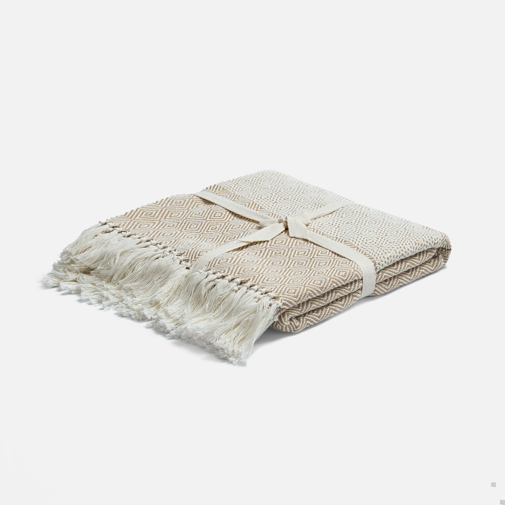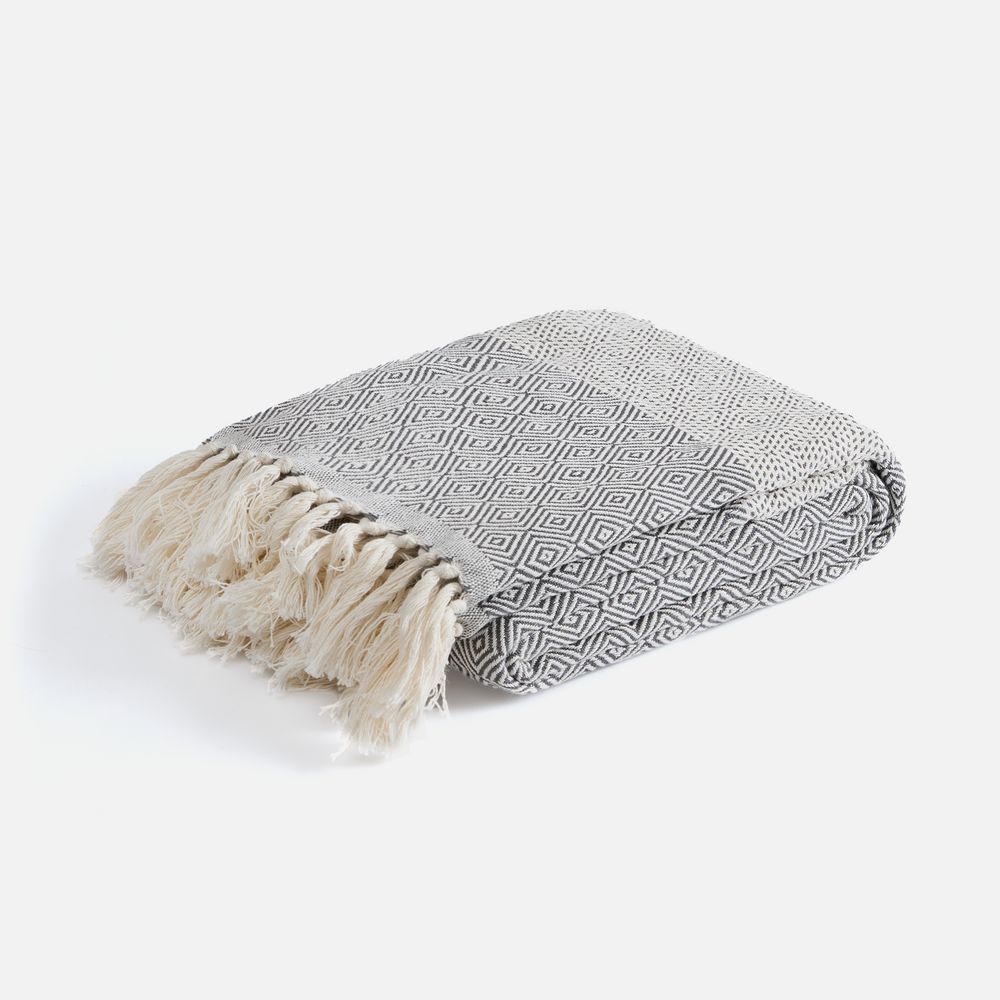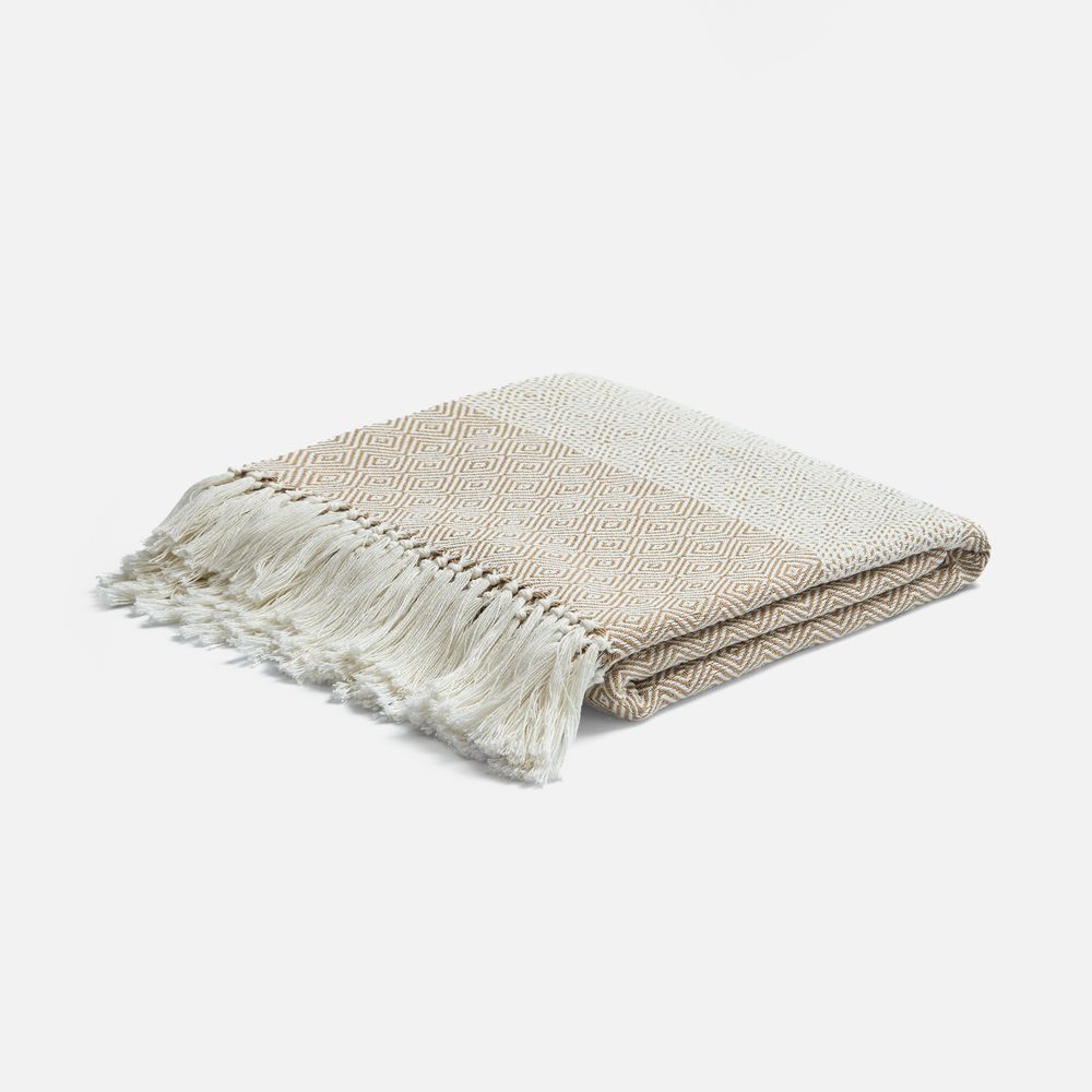 Плед Ladakh с динамичный геометрическим рисунком благодаря хлопку имеет мягкую и дышащую текстуру, а полиэстер добавляет прочности, помогает ткани не мяться, быстрее сохнуть и долго сохранять форму.