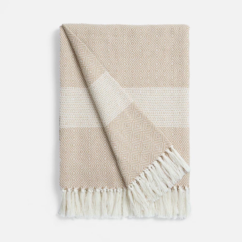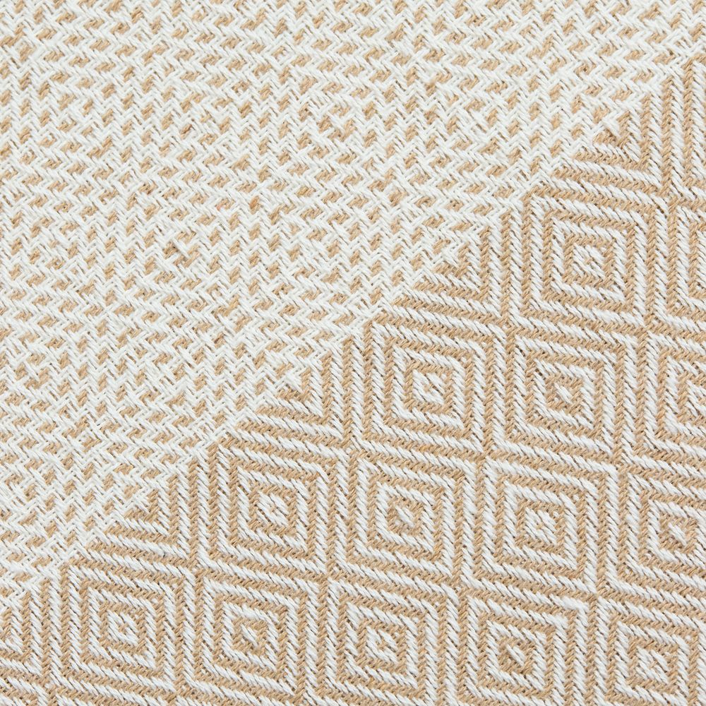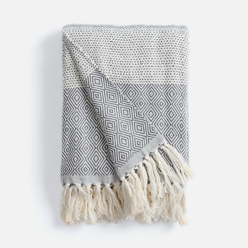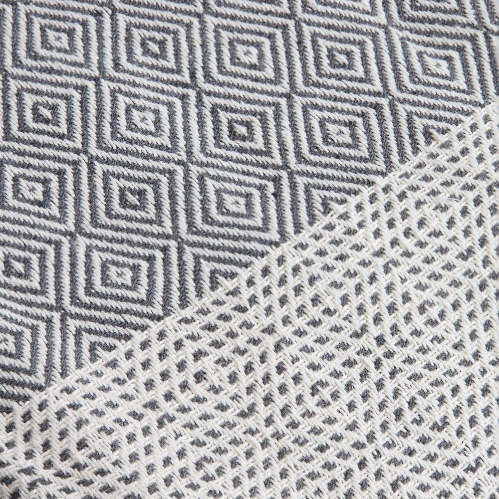 Плед Ladakh с динамичный геометрическим рисунком благодаря хлопку имеет мягкую и дышащую текстуру, а полиэстер добавляет прочности, помогает ткани не мяться, быстрее сохнуть и долго сохранять форму.