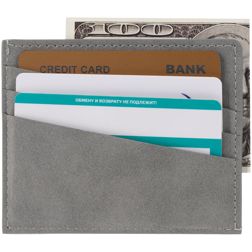 Чехол выполнен из материала Nubuck, дополнен окрашенным срезом края. Имеет 4 отделения для кредитных карт одно из них с подложкой из картона и 1 отделение для купюр.Поставляется без индивидуальной упаковки.