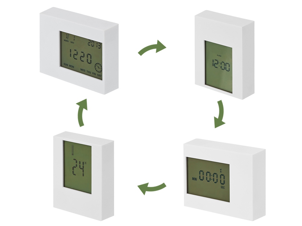Многофункциональные настольные часы с подсветкой, которые в зависимости от положения показывают разные значения: дата и время, будильник, таймер и температура воздуха. Вид механизма: электронный Источник питания: батарейка ААА- 2шт (в комплект не входит) Индикация: арабские цифры