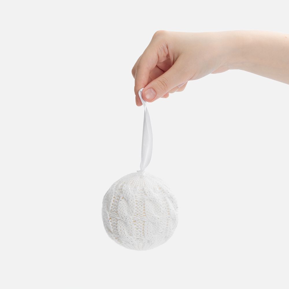 Вязаный шарик «Магия зимы» с узором в виде вязаных кос и вкрапления серебристого люрекса.