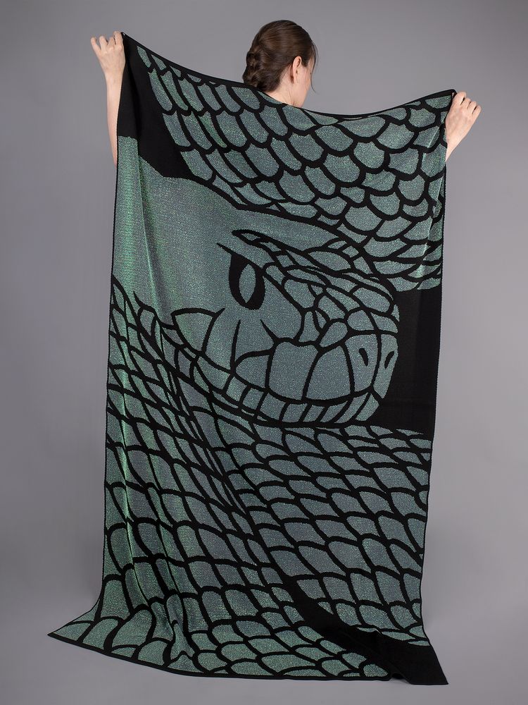 Плед Serpentica посвящен главной героине 2025 года — мудрой Змее, чья красота и гибкость тонко переданы в дизайне. Сам плед кажется воздушным и слегка полупрозрачным: узор связан с добавлением люрекса жемчужного оттенка, что выигрышно выделяет элементы и добавляет всему изделию притягательности и блеска.