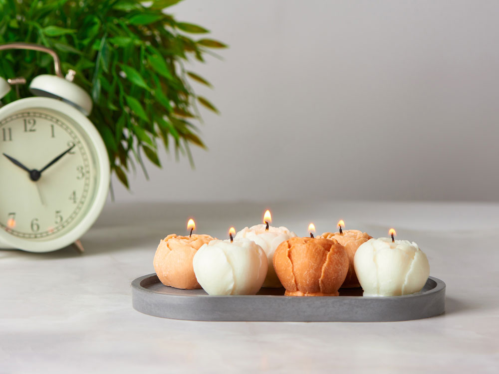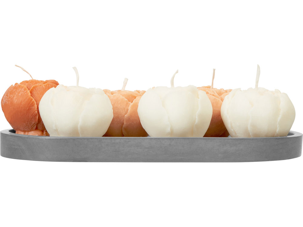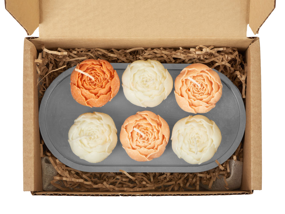 Набор из шести ароматических свечей в форме пионов поможет наполнить ваш дом нежностью и уютом. Природный дизайн в сочетании с графитово-серой подставкой из гипсобетона подойдет к любому интерьеру. В наборе три белых свечи со сладким ароматом французской ванили, две персиковых с согревающими и укутывающими нотками перца, нероли и амбры и одна темно-персиковая, обладающая свежим и успокаивающим запахом лаванды. Это позволяет выбрать аромат под настроение. Свечи на 80% изготовлены из натуральных соевого и кокосового воска, не токсичны при горении и не вредны для дыхания. После того как свечи прогорят, подставку можно использовать для пало санто или других благовоний, а также для хранения различных мелочей или ювелирных украшений. - Элегантный дизайн - Многофункциональная подставка из гипсобетона - Экосостав - Ручная работа Вид упаковки: упаковочная коробка.