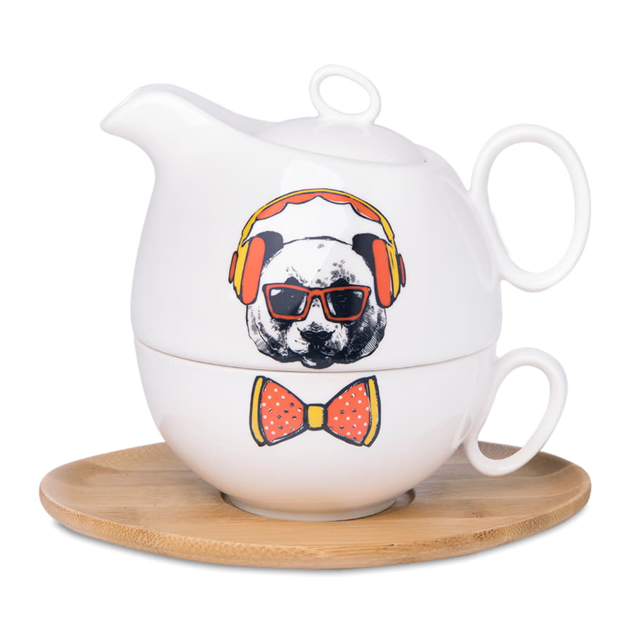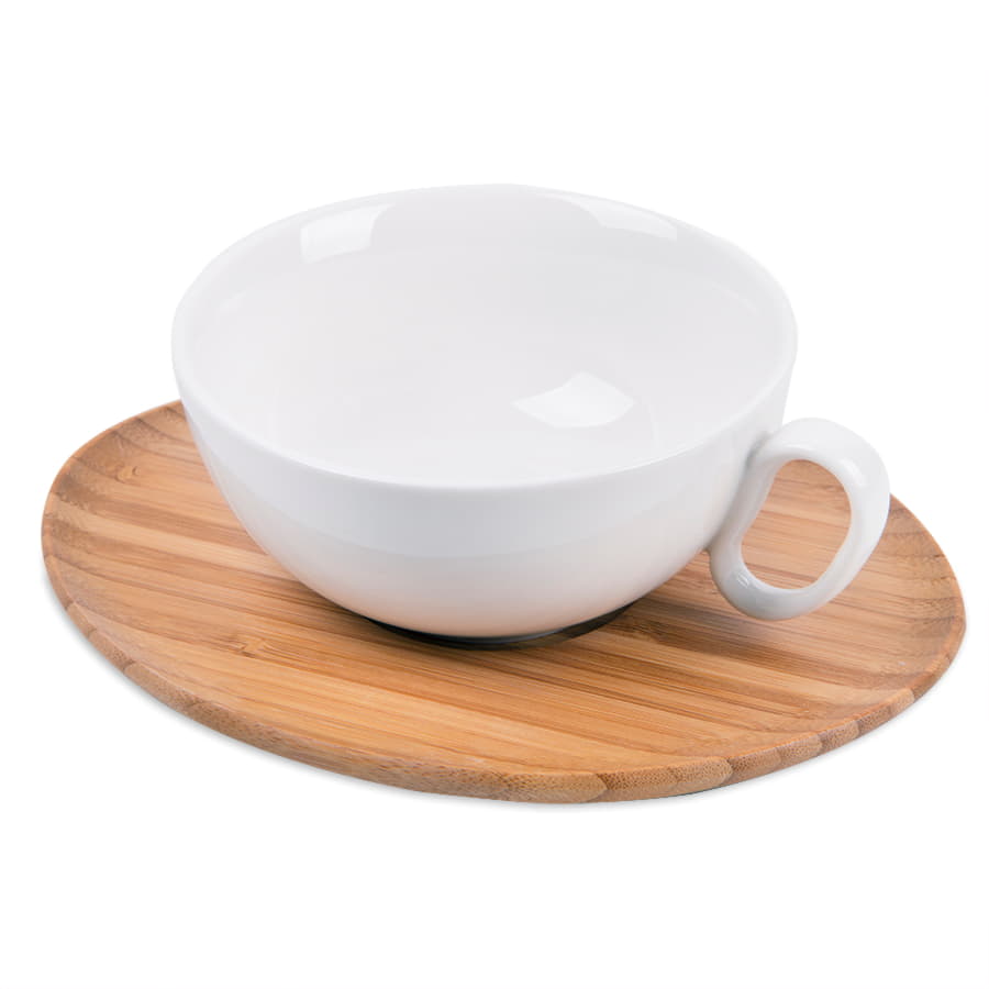 Необычный набор из фарфорового чайника и чашки на бамбуковой подставке-блюдце. Секрет этой пары в том, что чайник можно поставить на чашку сверху. Это позволяет и сэкономить место и сохранить температуру горячего чая или кофе как в чайнике, так и в слегка неполной чашке. Широкое блюдце не скользит и не царапает даже самую хрупкую поверхность, а оригинальный дизайн с удобными ручками-петельками. Поставляется в стильной подарочной упаковке.