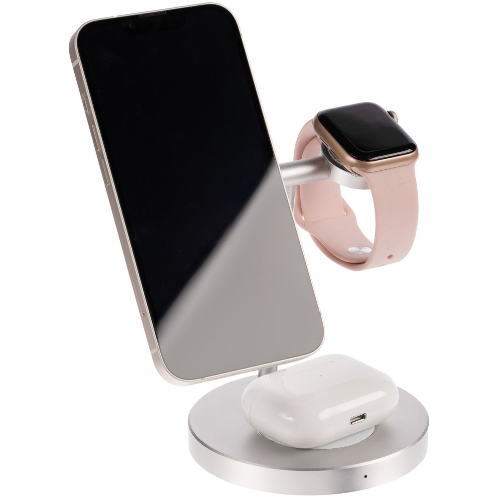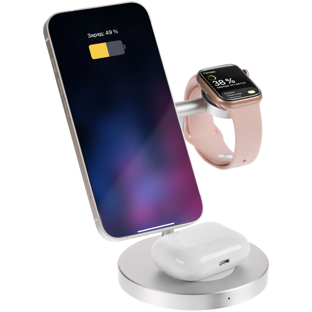 Футуристичный дизайн металлической конструкции с первого взгляда превращает магнитную зарядную станцию Orbis из утилитарного девайса в ценный объект современного дизайна. Станция может заряжать одновременно 3 устройства: беспроводные наушники с соответствующей функцией беспроводного заряда, смартфон, часы Apple Watch 2–8. Смартфоны iPhone 12–15 удерживаются на станции встроенными в их корпус магнитами. Прочие телефоны рекомендуем дополнить магнитным стикер-адаптером Magmate для надежного удержания на зарядной области. Выходная мощность беспроводного заряда при использовании зарядного устройства QC 2.0–3.0 (18–20 Вт) с параметрами зарядки не менее 5 В, 2 А; 9 B, 2,2 A: — основная магнитная область: 10 Вт — область для наушников на основании станции: 3 Вт — область для Apple Watch c поддержкой QI (Watch 2–8): 1 Вт В комплекте: зарядная станция, кабель с разъемом Type-C, инструкция. От USB-порта компьютера работа устройства невозможна. Поставляется в индивидуальной упаковке. Внимание! Не все модели смартфонов, часов и наушников поддерживают функцию беспроводной зарядки.
