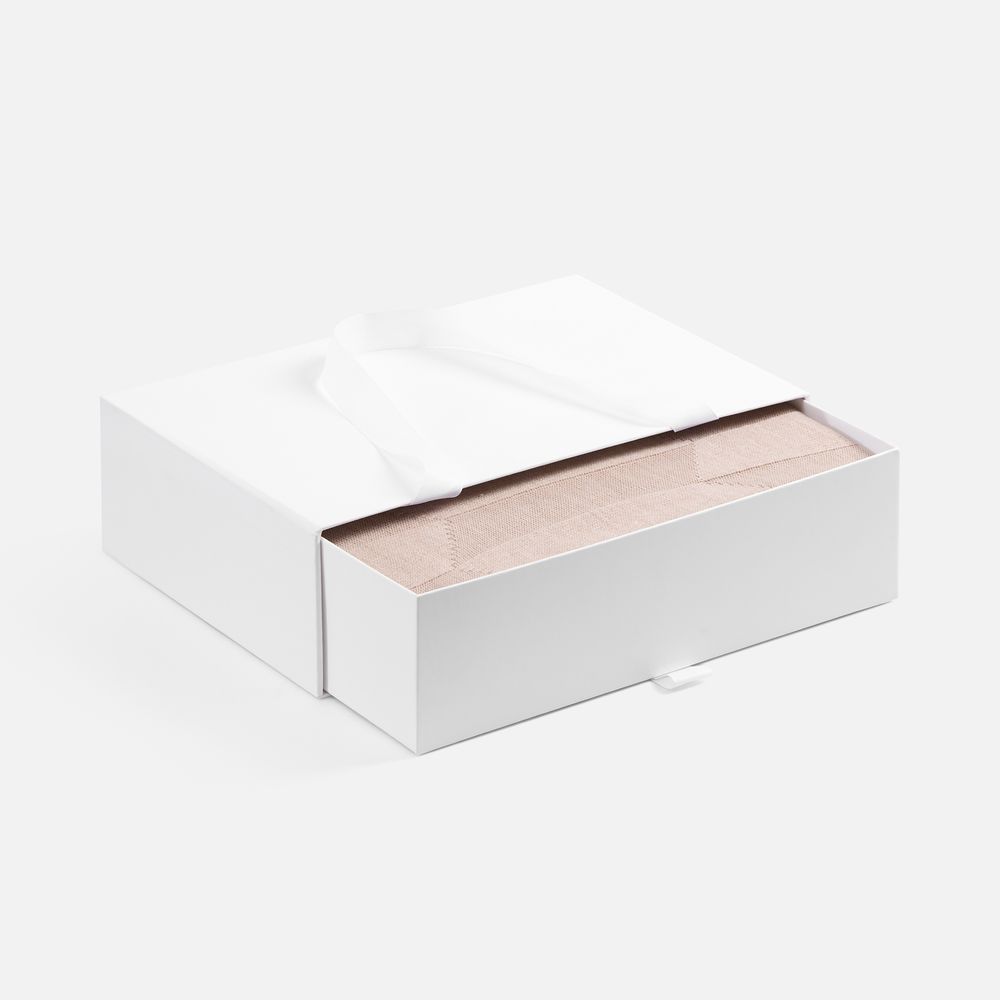 Внешний короб каширован дизайнерской бумаги, внутренний короб отделан белой бумагой, ламинированной матовой пленкой.