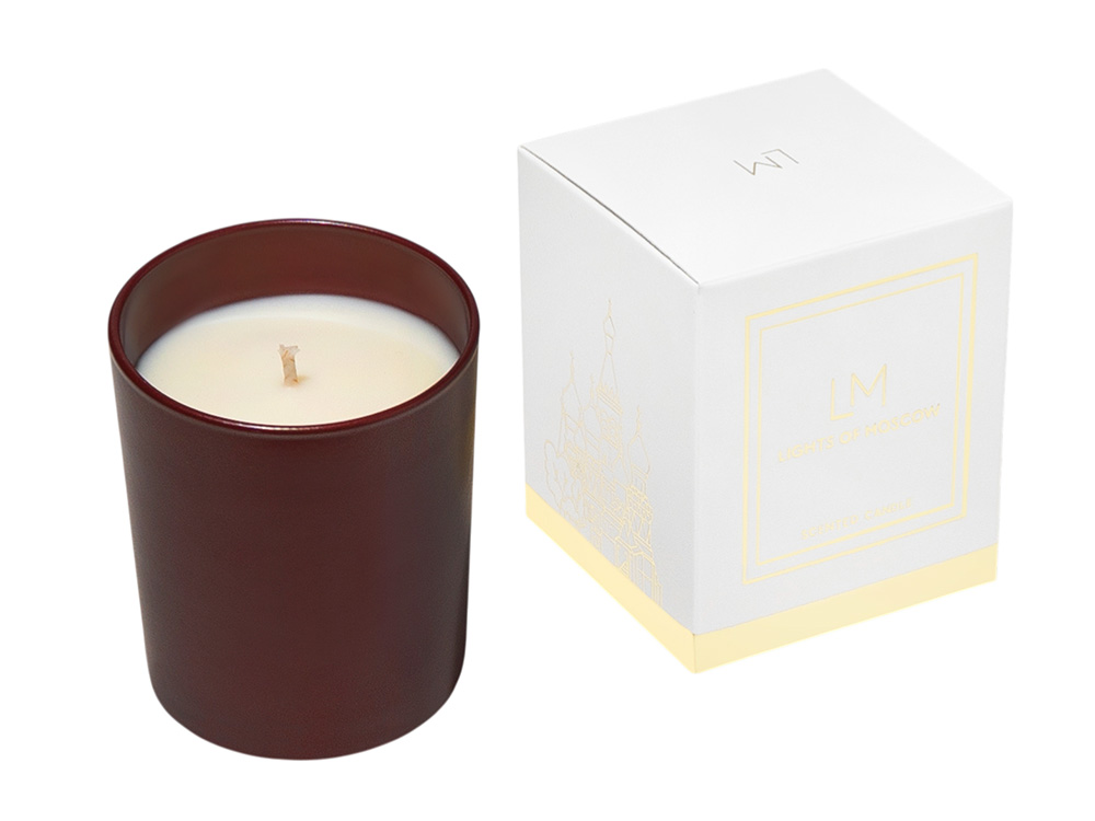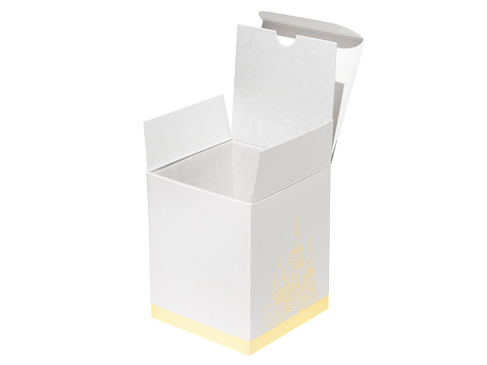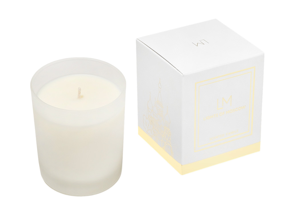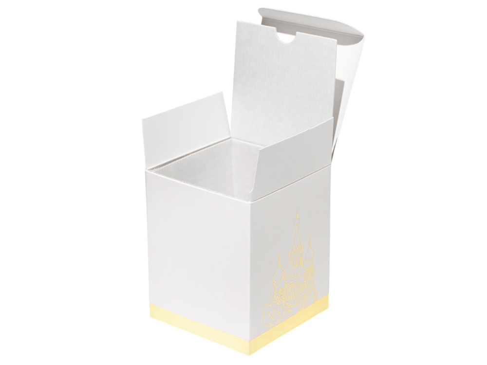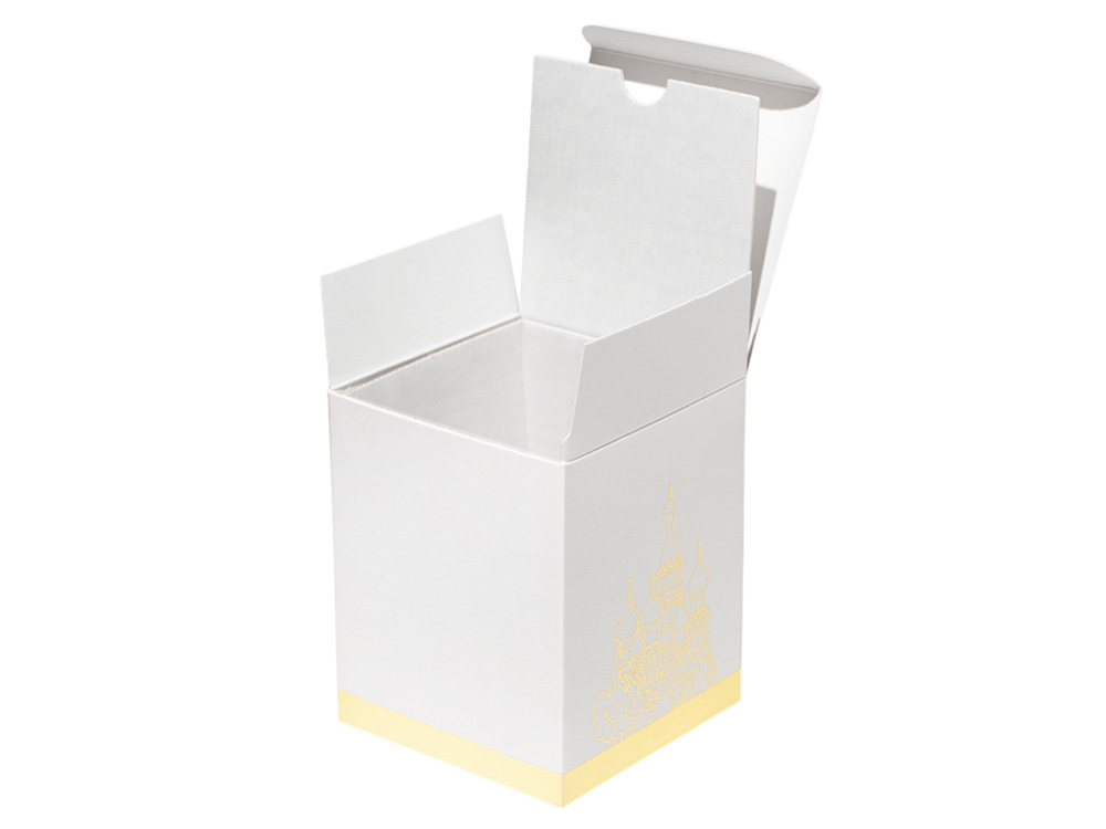Упакована свеча в белую коробку с ярким золотым фольгированием, на левой стороне коробки изображен Храм Василия Блаженного - одна из главных достопримечательностей на Красной площади в Москве.