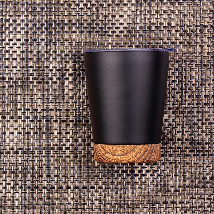 Стильная термокружка с черным матовым корпусом и декоративной вставкой с имитацией фактуры дерева soft-touch. Двойные стенки из стали сохранят напиток горячим до 3х часов. Высота без крышки 11,4 см, подходит для большинства кофемашин.