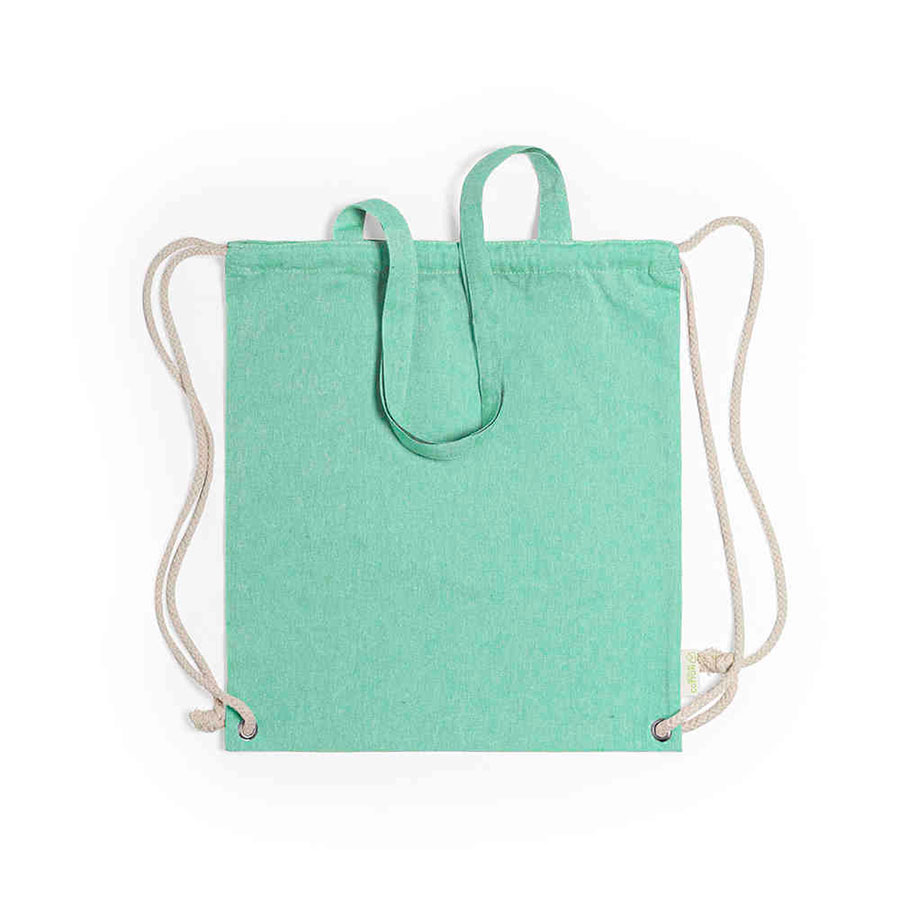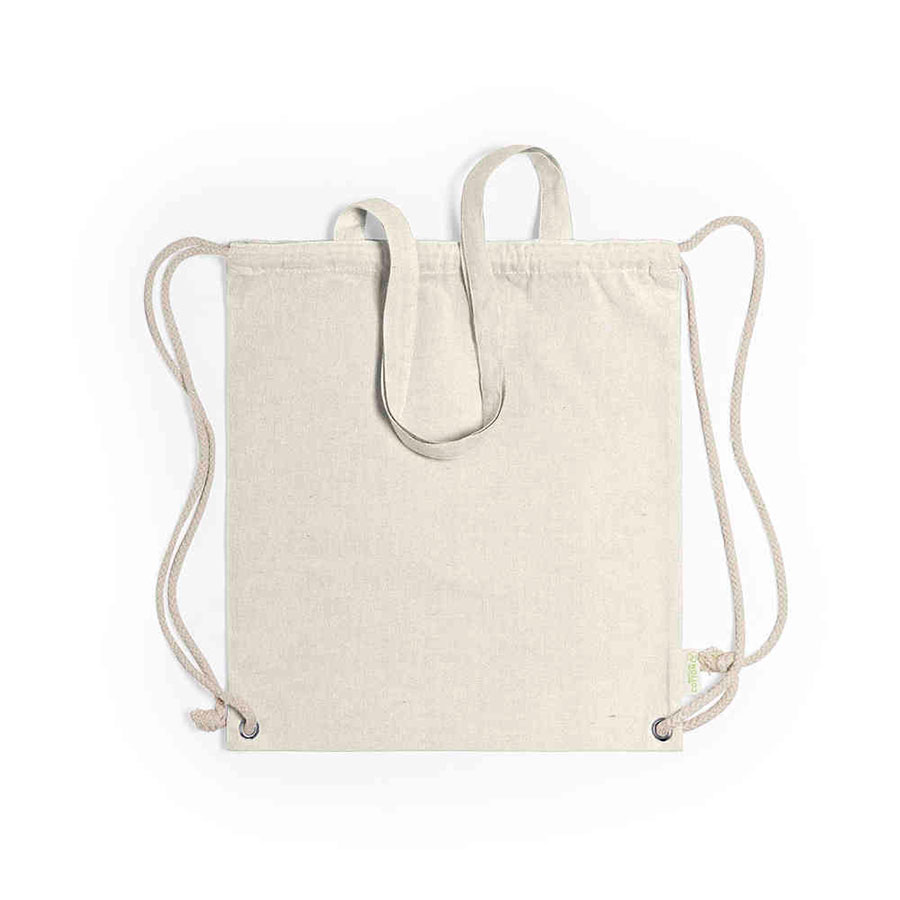 Сумка-рюкзак выполнен из 100% переработанного хлопка, плотностью 140 г/м2. Переработанный хлопок получается из отходов текстильного производства или из старой одежды. Исходный материал измельчается, потом из этой массы вытягивают нити, из которых ткут новую ткань. В переработанных тканях модная индустрия видит будущее. И оно уже здесь. Сумки, созданные из переработанного хлопка, ничуть не хуже «первичных». Они не отличаются на ощупь и служат так же долго, как и модели из не переработанного материала. Ручки для переноски 70 см и шнуры из хлопкас усиленными металлическими люверсами. Сумка выдерживает нагрузку до 9 кг.