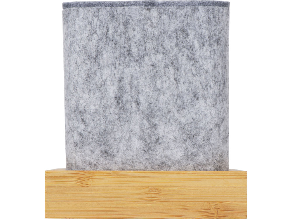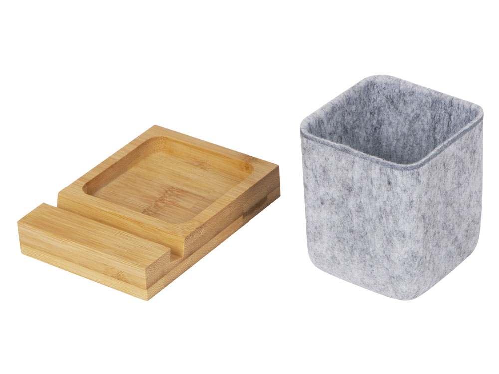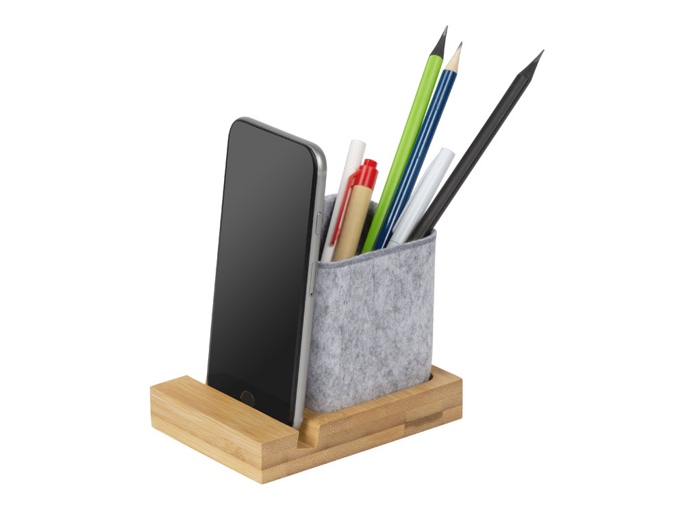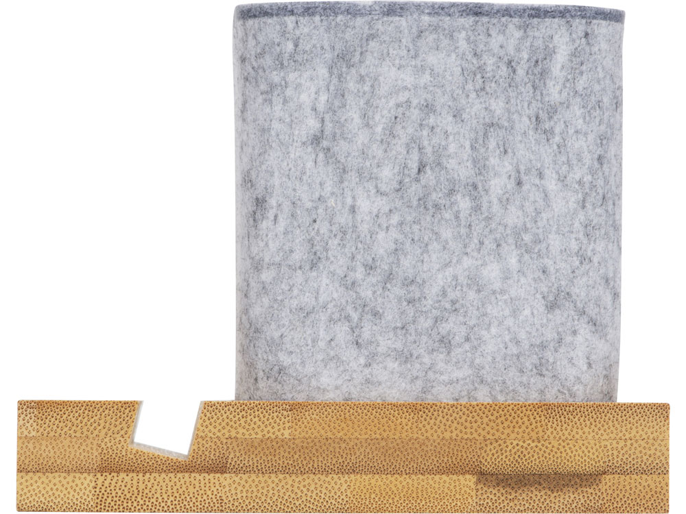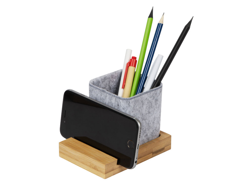 Подставка на рабочий стол для ручек и карандашей из RPET-фетра на подставке из бамбука. У бамбуковой подставки выемка, в которую можно поставить телефон.
