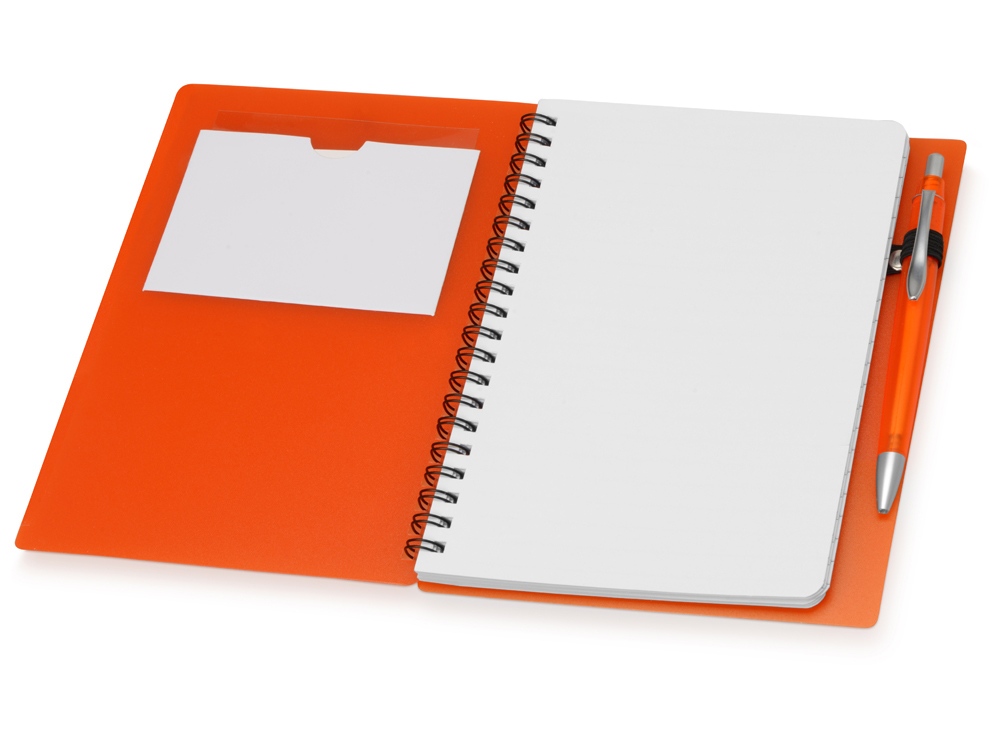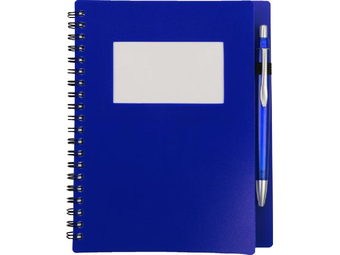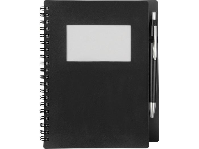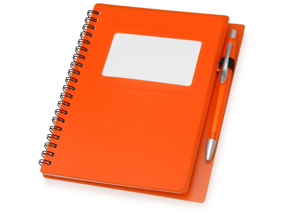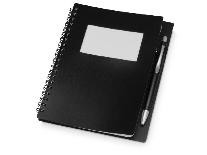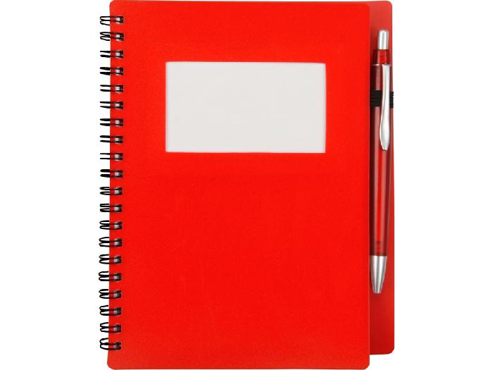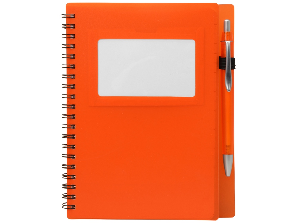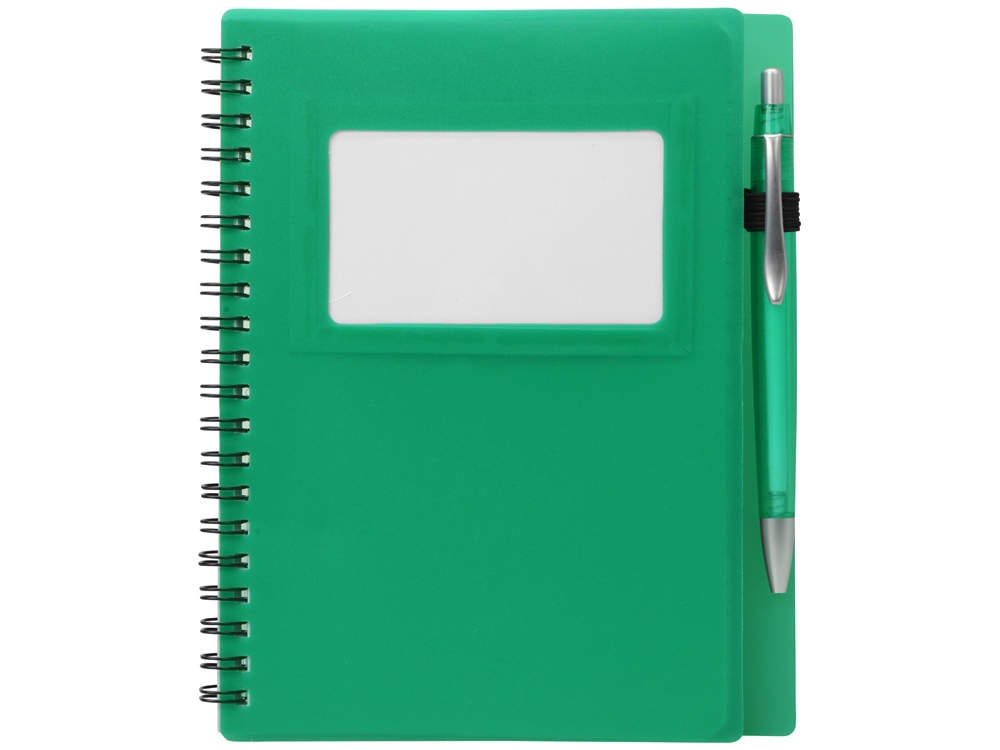 Блокнот Контакт с окошком, в которое можно поместить визитную карточку или полиграфическую вставку. Размер окошка внешний 8,4 х 4,8 см, внутренний 10 х 6,5 см. •Гибкая обложка из полипропилена. •Переплетен на пружине. •Блокнот 130 х 183 х 7 мм. •Разлиновка в линейку. •Кол-во листов 70. •Цвет бумаги белый. •Держатель для ручки резинка. •Цвет среза белый. В комплекте с блокнотом идет ручка с нажимным механизмом и синими чернилами вставляется в петельку расположенную на боковой части блокнота. •Ручка шариковая d12 х 132 мм.