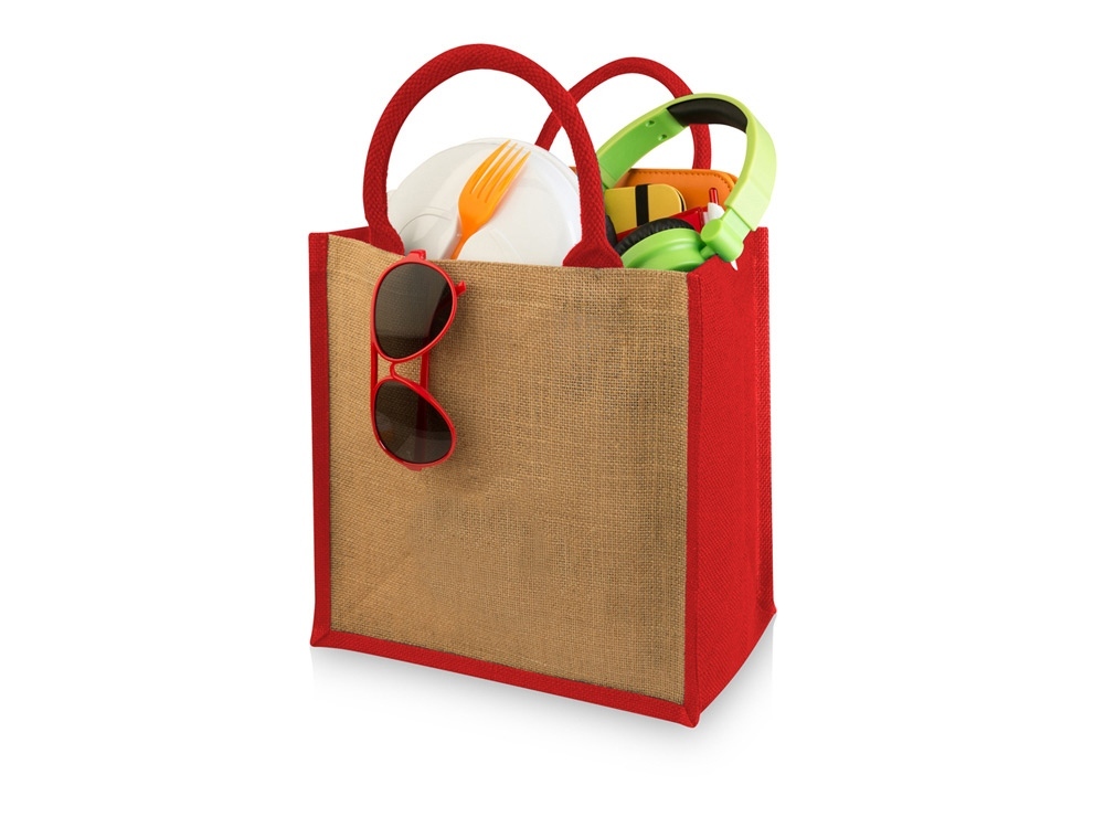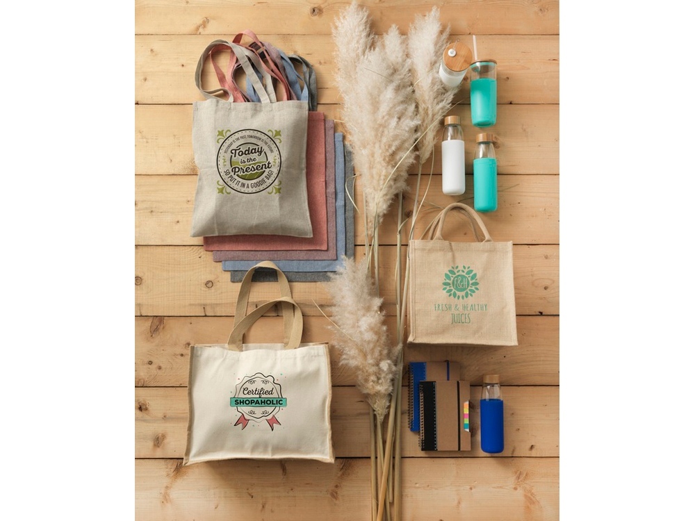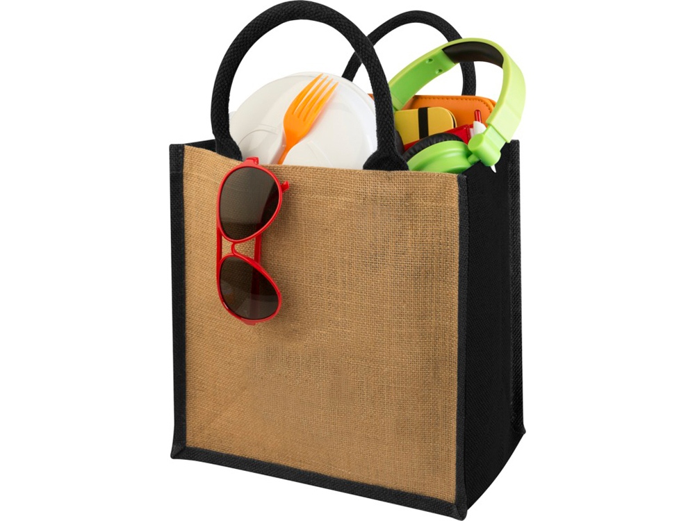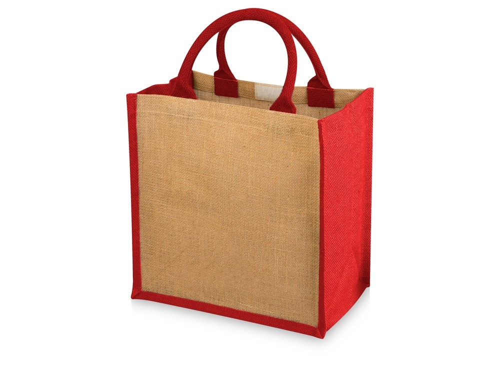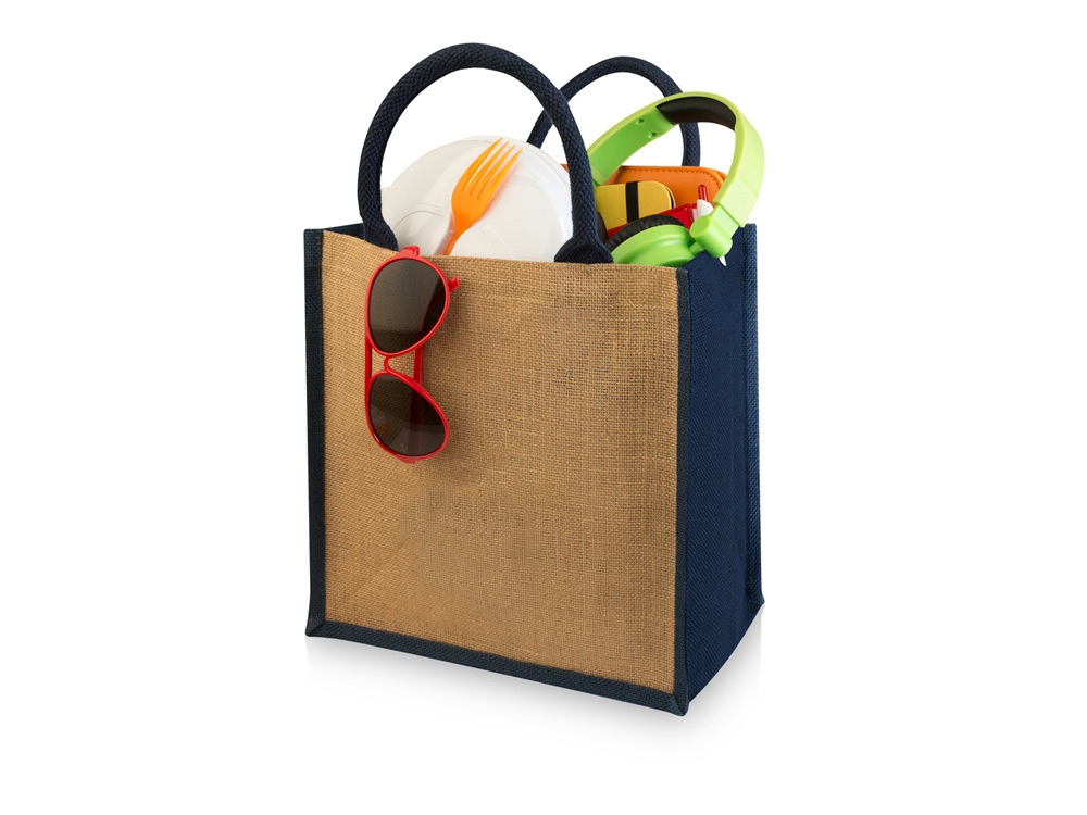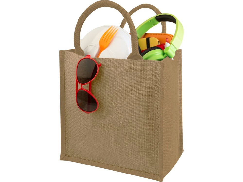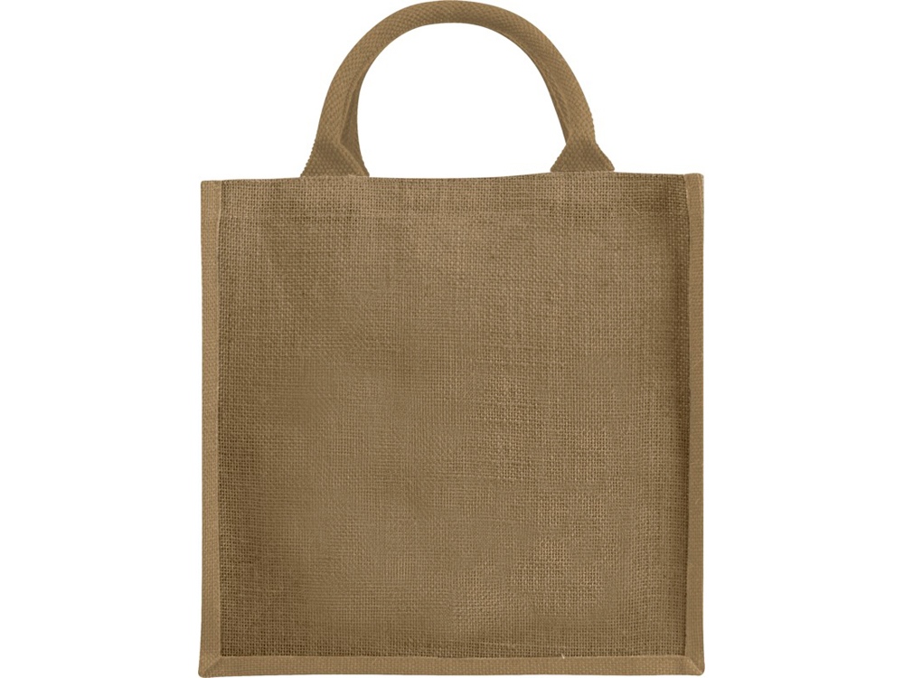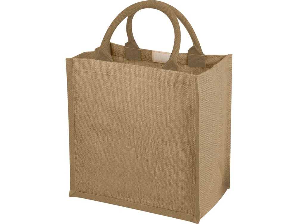 Джутовая подарочная сумка с ламинированным открытым основным отделением, которое застегивается на липучку. Хлопковые ручки высотой 11,5 см. Длина ручек 31 см Максимальная нагрузка 8 кг