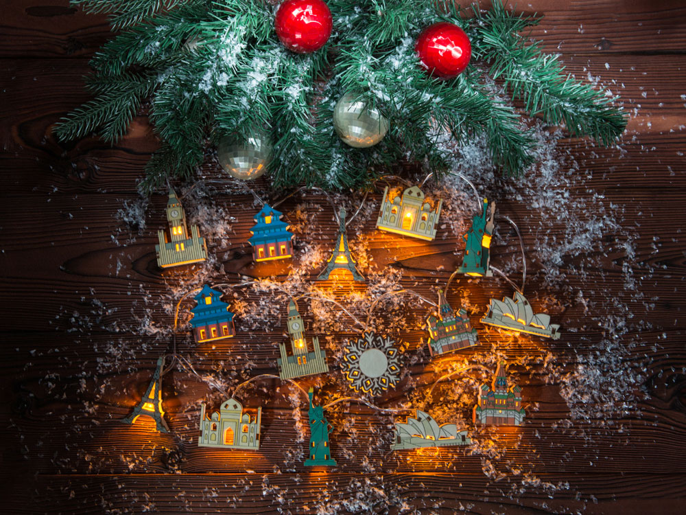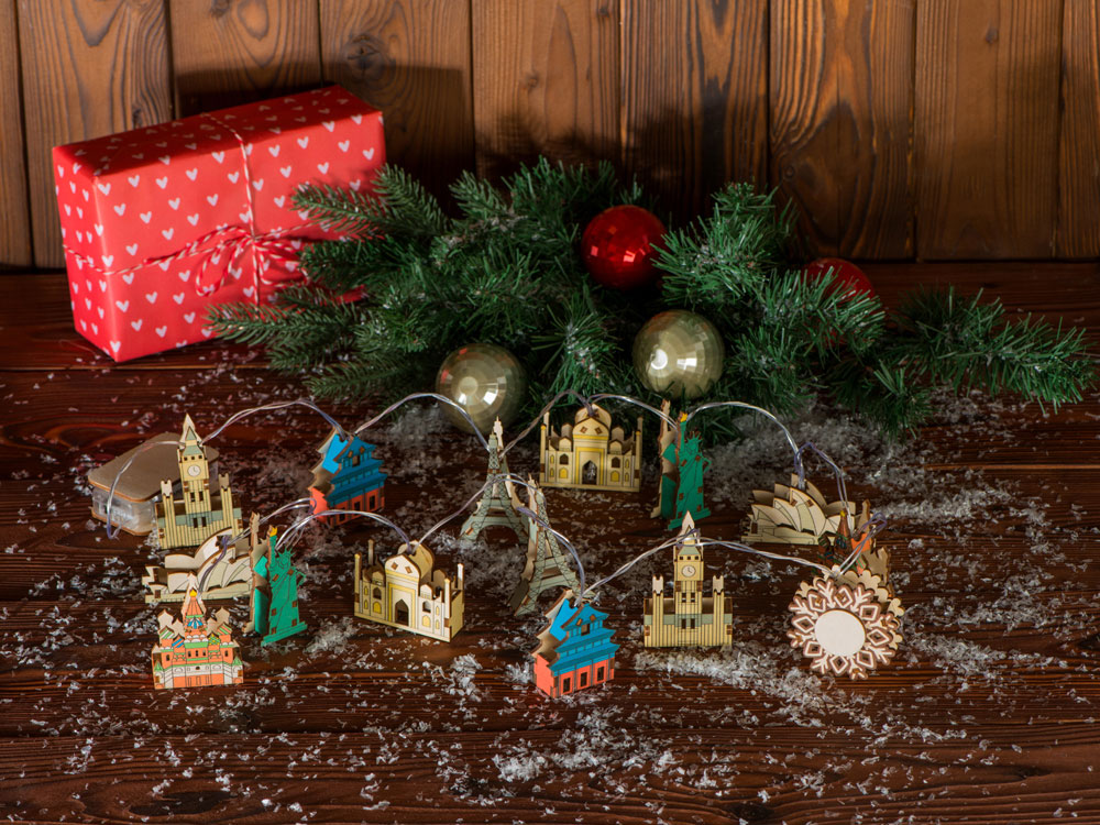 Новогодняя ёлочная гирлянда постоянного свечения с цветными фигурками достопримечательностей из натуральной березовой фанеры сделает процесс украшения ёлки или дома не только увлекательным, но и познавательным! Гирлянда состоит из 14 парных фигурок достопримечательностей и центрального элемента в виде снежинки. Снежинка и корпус батарейного блока имеют дополнительные съемные панели, которые поставляются в наборе в виде отдельных деталей и крепятся на изделие на двусторонний скотч. Эти элементы специально предназначены для нанесения и придания презенту уникальности. Гирлянда работает от 2-х батареек АА, которые входят в комплект. На гирлянде изображены следующие достопримечательности: Биг Бен Лондон, Англия Храм неба Пекин, Китай Эйфелева башня Париж, Франция Тадж-Махал Агра, Индия Статуя Свободы Нью-Йорк, США Сиднейская опера Сидней, Австралия Храм Василия Блаженного Москва, РФ