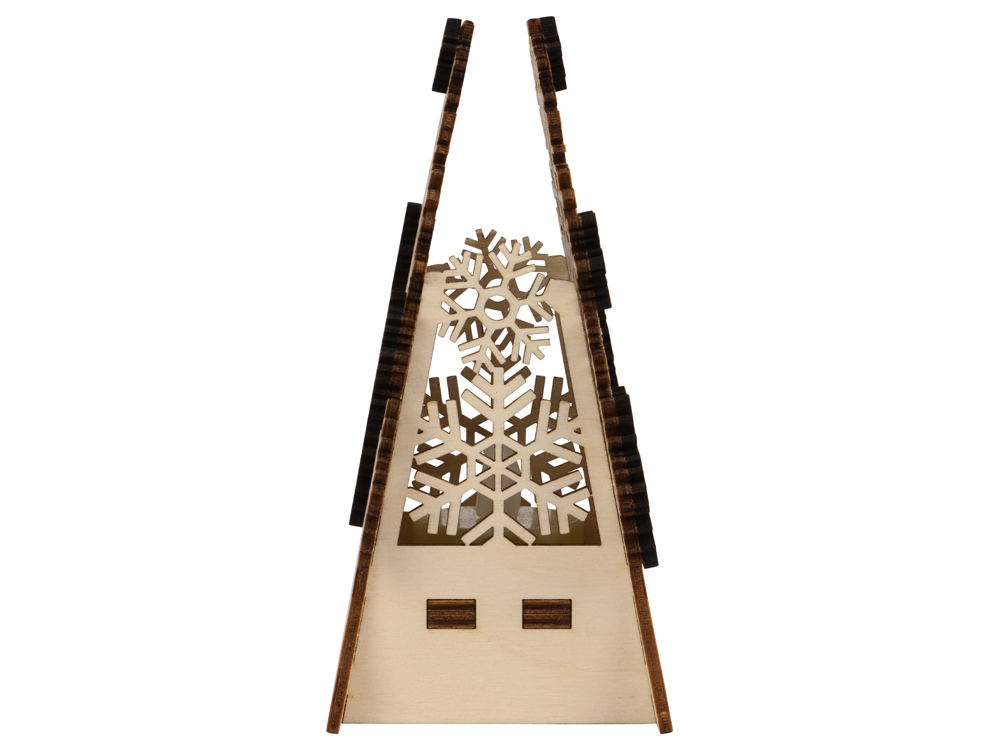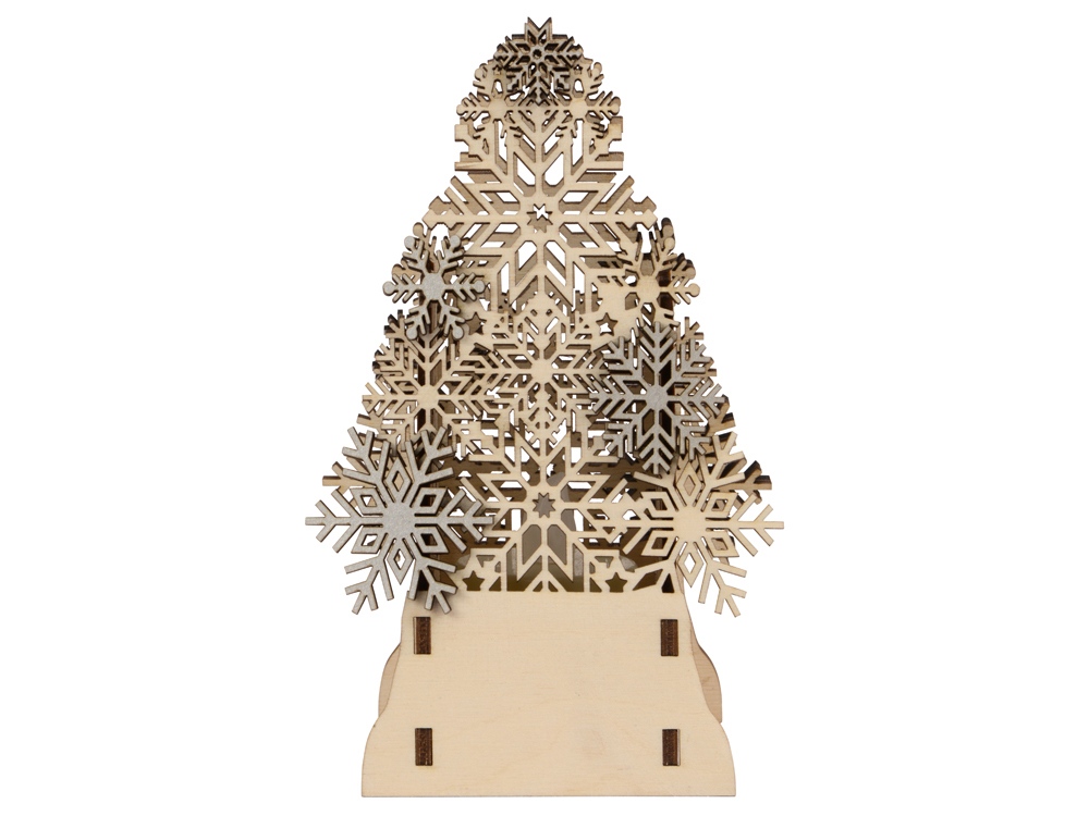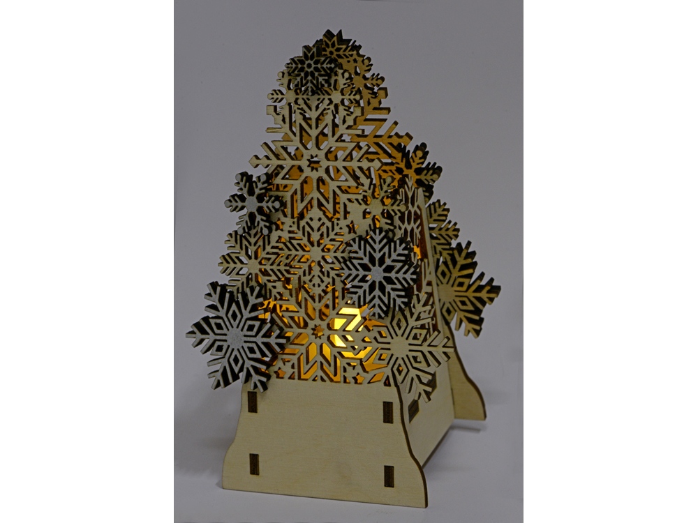 Фонарик с электрической свечой в виде резной елочки с декоративными снежинками серебристого цвета. Батарейка в комплекте. Для удобства нанесения Вашего логотипа, елочка поставляется в комплекте с деревянным шильдом, на котором можно сделать гравировку и другие виды дизайна.