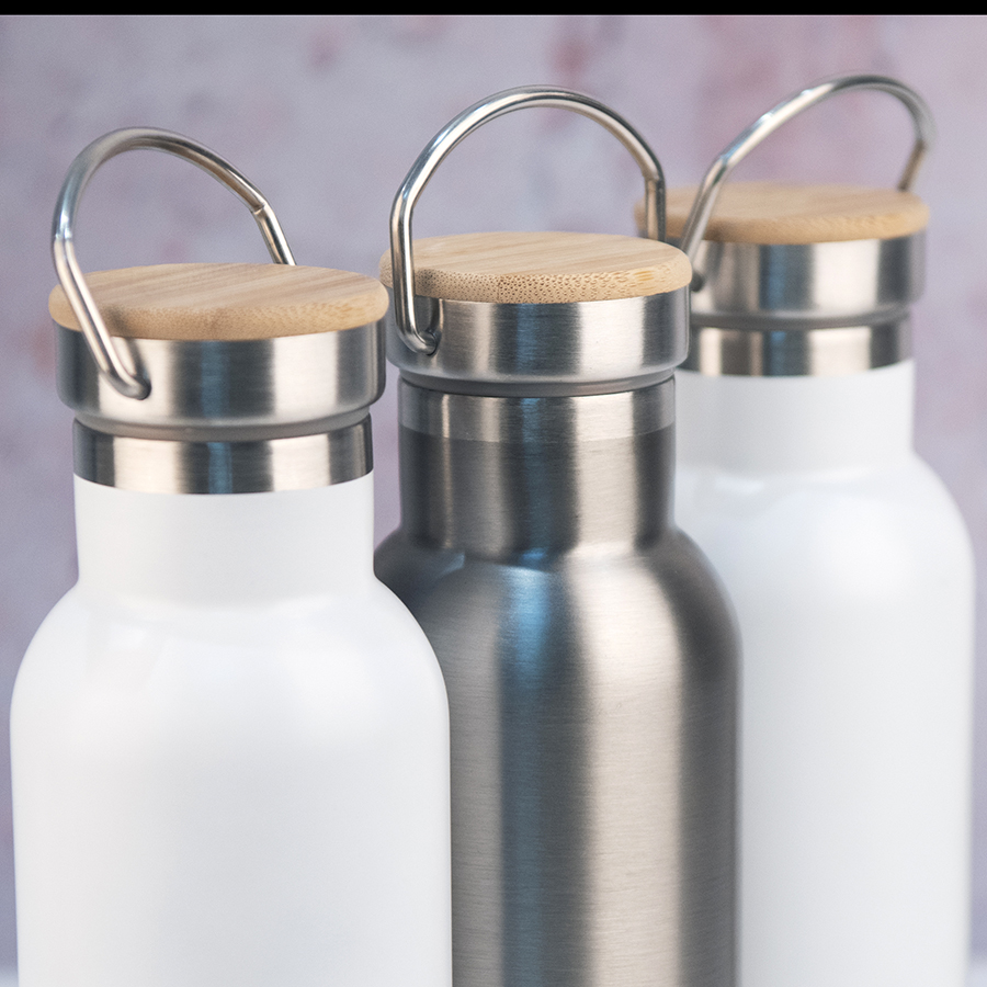 Бутылка для воды с двойными стенками из нержавеющей стали.Держатель на крышке для удобства переноски.Верхняя часть крышки из бамбука, отлично подходит для персонализацииБлагодаря двойным стенкам, температура напитка в бутылке будет в полной сохранности на протяжении 2-3 часов.Индивидуальная упаковка - коробка из крафтового картона