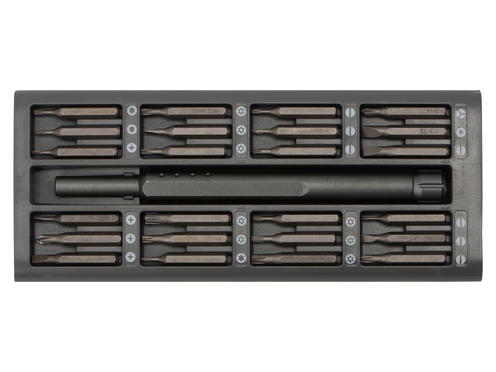 Набор из 24 насадок в металлическом кейсе. Насадки изготовлены из долговечной стали S2, твердость HRC 58-6. Включает наиболее распространенные и востребованные комплектующие для ремонта мобильных телефонов, планшетов, ноутбуков, игровых приставок и других электронных устройств.