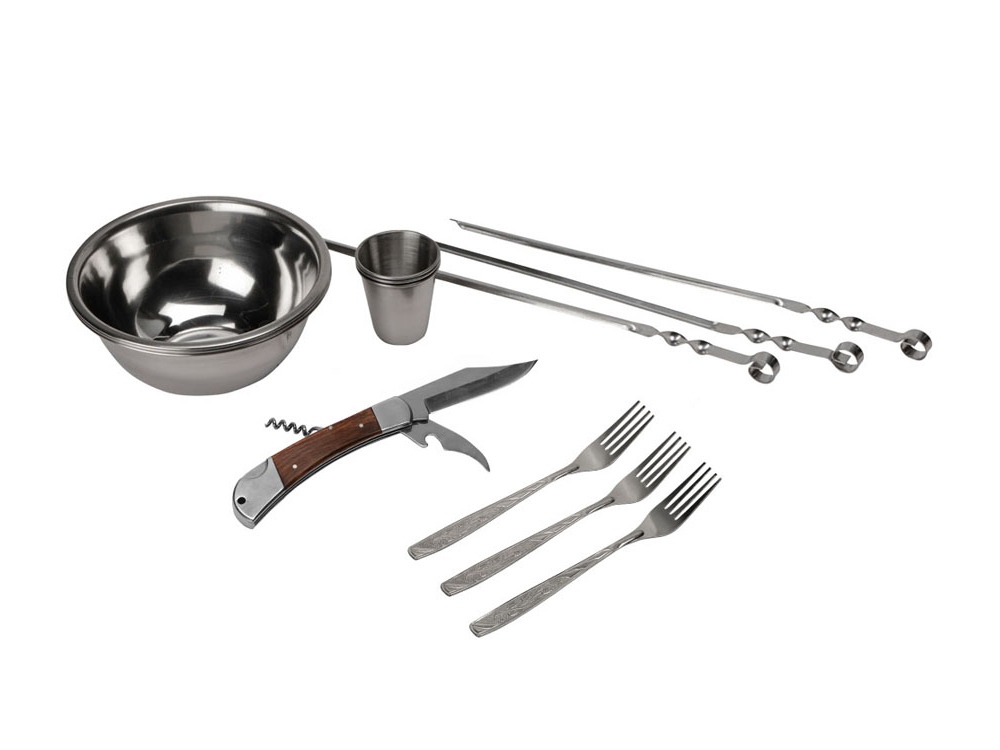 Кейс из сплит-кожи, с повышенной износостойкостью, внутренняя отделка натуральная кожа с художественным выжиганием. В комплекте: стопка нерж. сталь 70мл- 3шт, вилка столовая нерж. сталь- 3шт, миска нерж. сталь 500 мл- 3шт, шампура нерж. сталь 35 см- 3шт, многофункиональный нож.