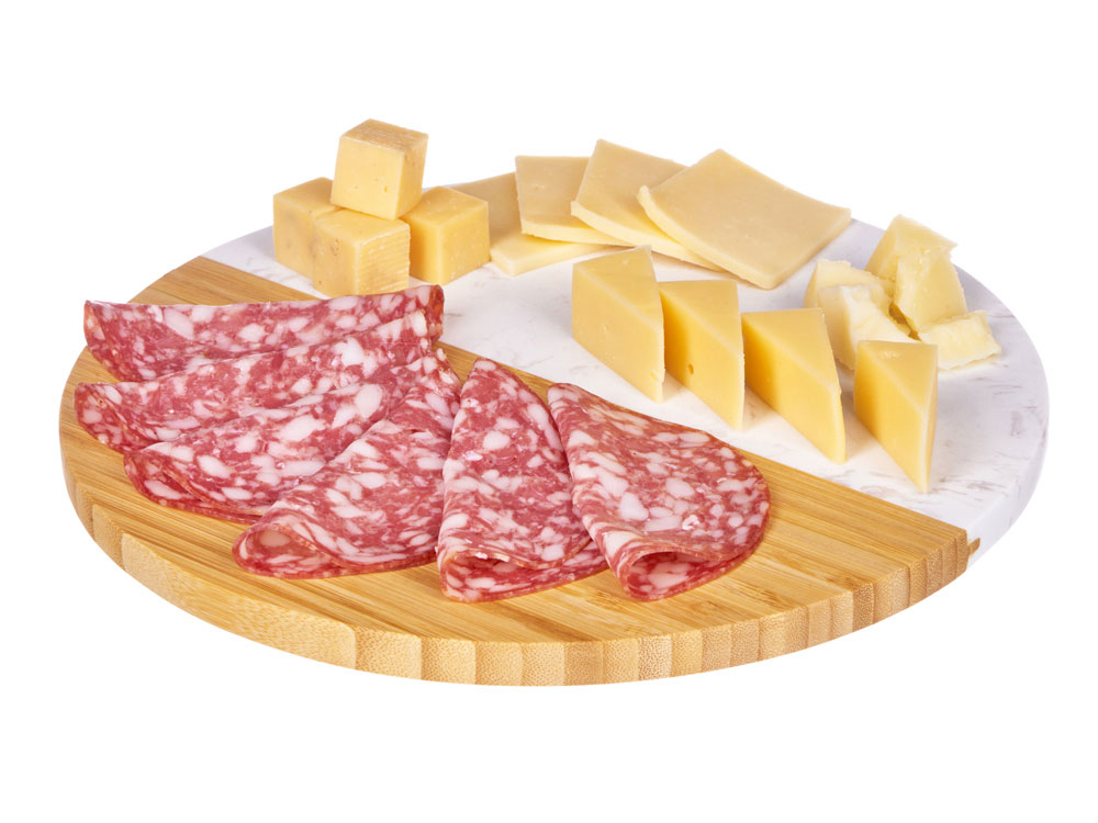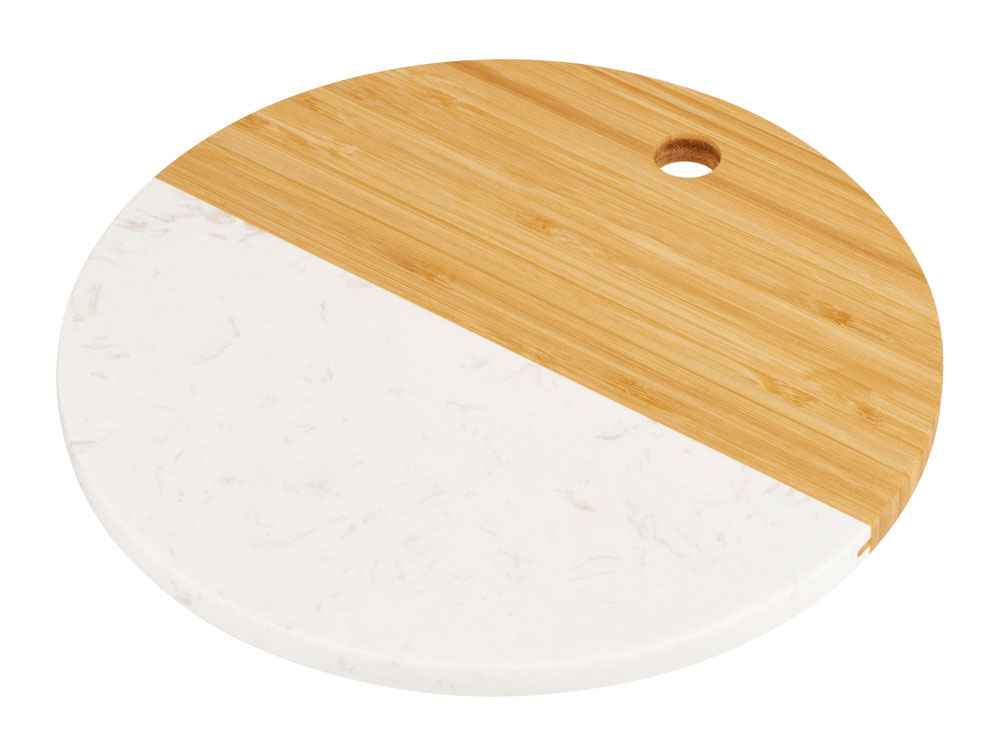Разделочная доска от Eat&Bite состоит наполовину из бамбука, а вторая половина выполнена из мрамора. Это позволяет не только использовать доску для разделки, но и оригинально подать закуски, сыры или нарезки, зонируя виды снеков. - можно сочетать с другими товарами бренда Eat&Bite в сетах - для разделки и сервировки - необычное сочетание искусственного мрамора и бамбука можно обыграть интересным образом при помощи нанесения — например, при помощи надписей, бегущих в разные стороны, или выбором изображений, обыгрывающих разницу материалов - ушко для подвешивания Не рекомендуется мыть доску в посудомоечных машинах.
