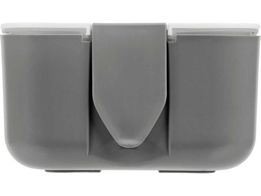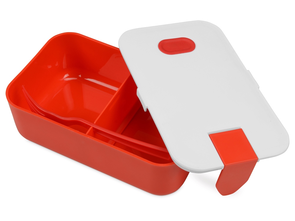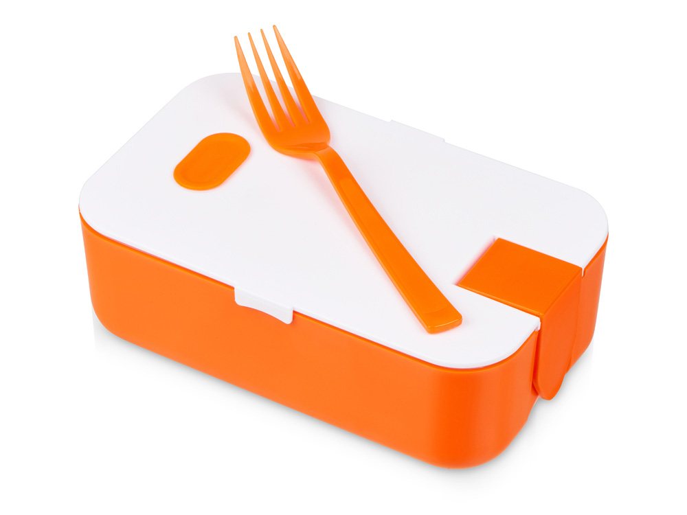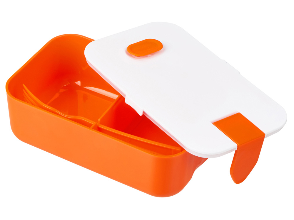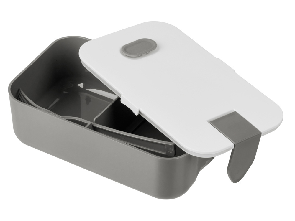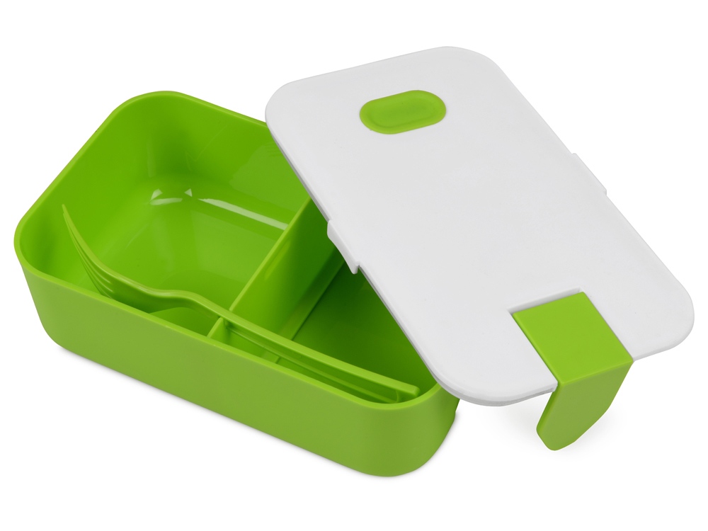 •Внутри прочной пластиковой емкости находятся снимаемая перегородка и вилка.