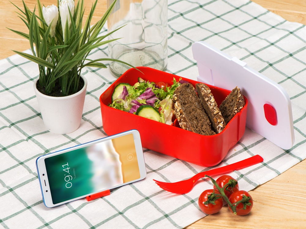 •Деталь для фиксации крышки контейнера выполняет дополнительную функцию подставки для телефона, что особенно понравится тем, кто привык смотреть видео или читать книги во время перекуса.