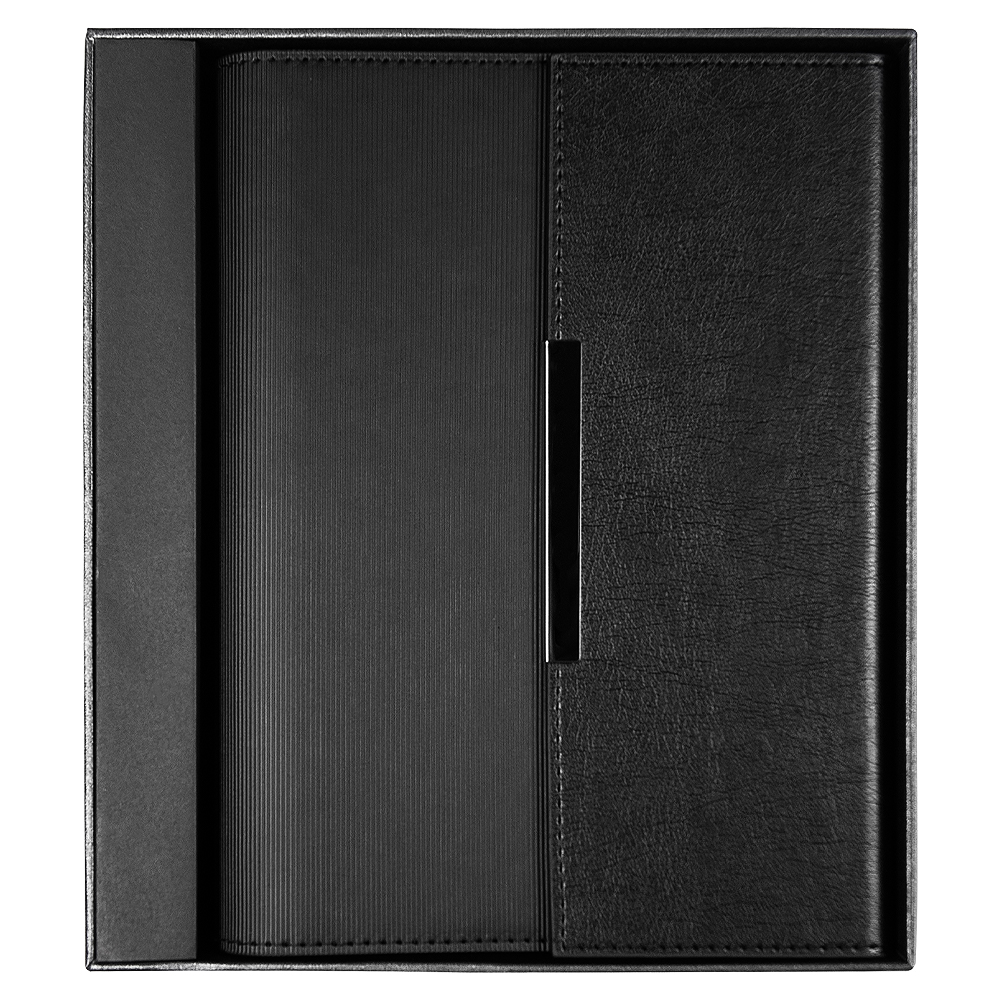 В комплекте ежедневник Flexy Ausone черного цвета (артикул: 15121). Ежедневник недатированный, в гибкой обложке. Выполнен из искусственной кожи. Поверхность материала Ausone фактурная, с легким рисунком прожилок и морщинок, создающим эффект натуральной кожи. Имеет мягкий блеск.