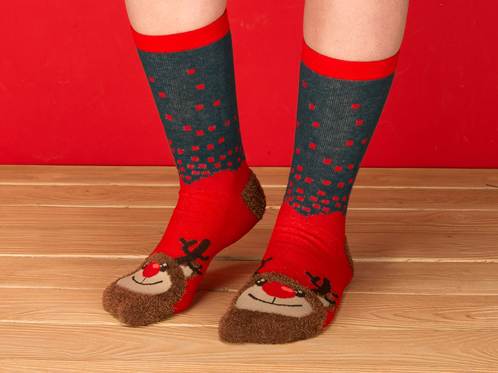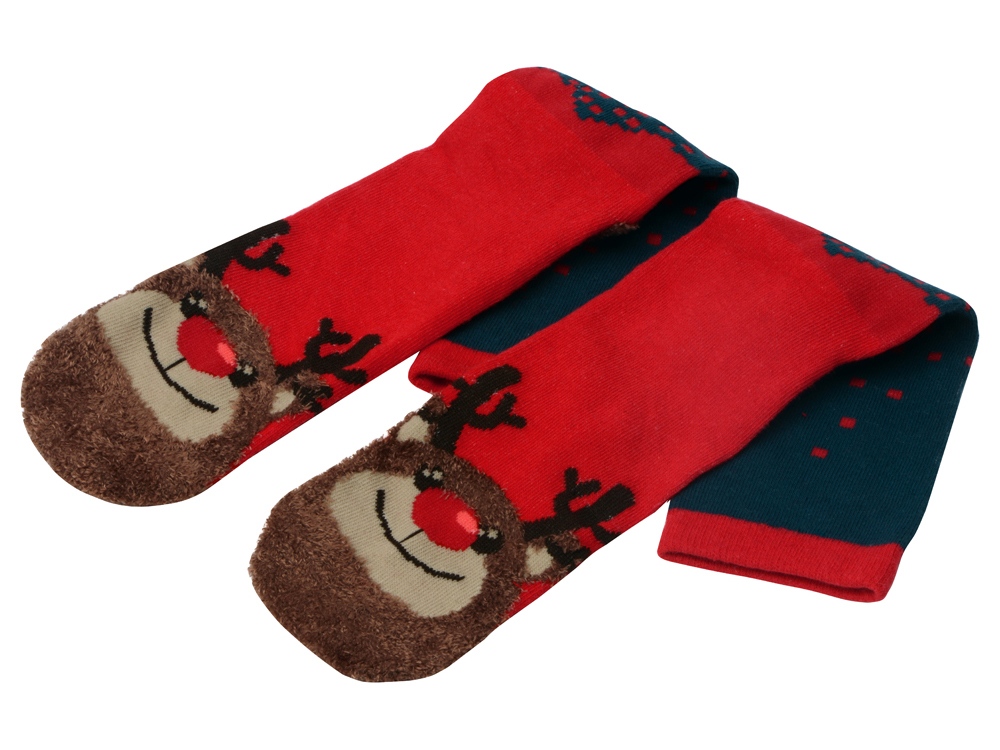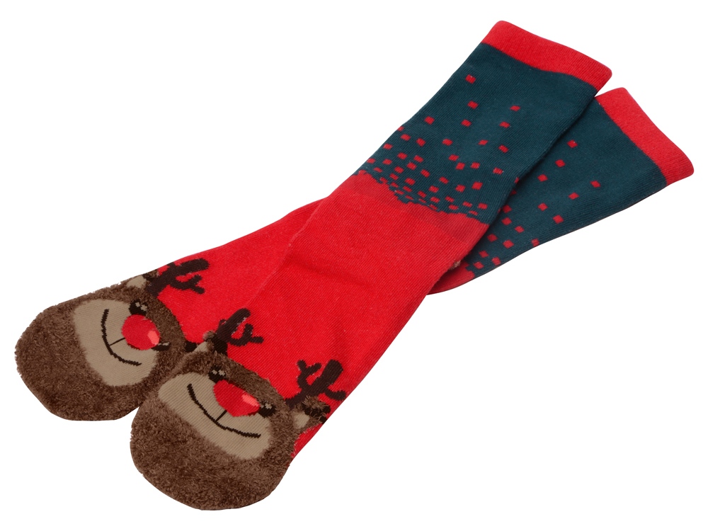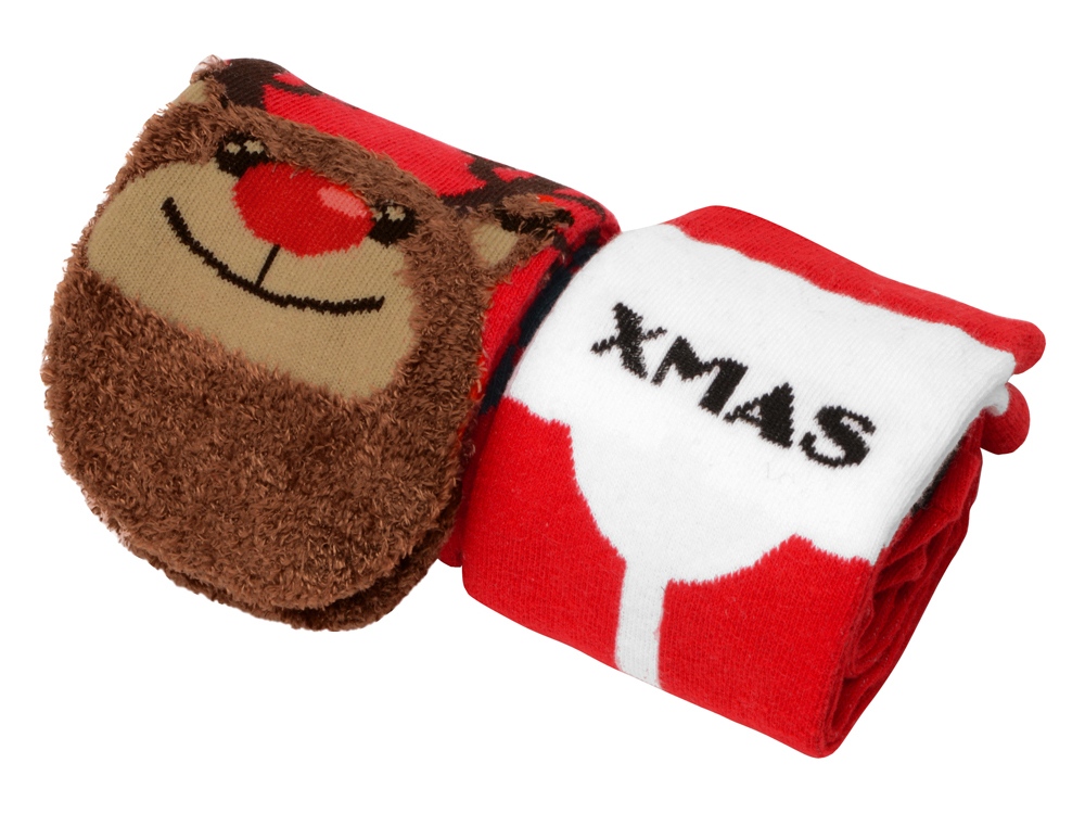 Рождественские носки прекрасно подойдут на роль подарка, который создает праздничное настроение. Этот набор состоит из двух пар, которые упакованы в мешочек из натурального хлопка. Одна пара украшена мягкими пушистыми мордочками рождественских оленей, а принт на второй изображает сапожки Санта Клауса. Ткань -- смесь хлопка, полиэстера и спандекса, что обеспечивает носкам износостойкость, а мягкая широкая резинка – удобную посадку по ноге. Мешочек-упаковку можно брендировать по вашему желанию. Размер носков 36-39.