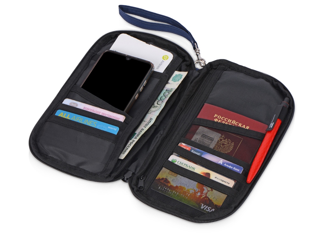 Органайзер для документов "Keep Safe" – изготовлен из плотного текстиля, который устойчив к износу и при необходимости легко чистится. • Несколько отделений разной формы позволяют разместить паспорт, проездные билеты, путевки, пластиковые карточки, удостоверения и другие важные документы • Плотные стенки надежно защищают содержимое от деформации и обеспечивают сохранность документов во время длительной транспортировки • Крепление для ручки фиксирует письменные принадлежности, и они не выпадут при открытии органайзера • Ремешок делает органайзер удобным для переноски в руке