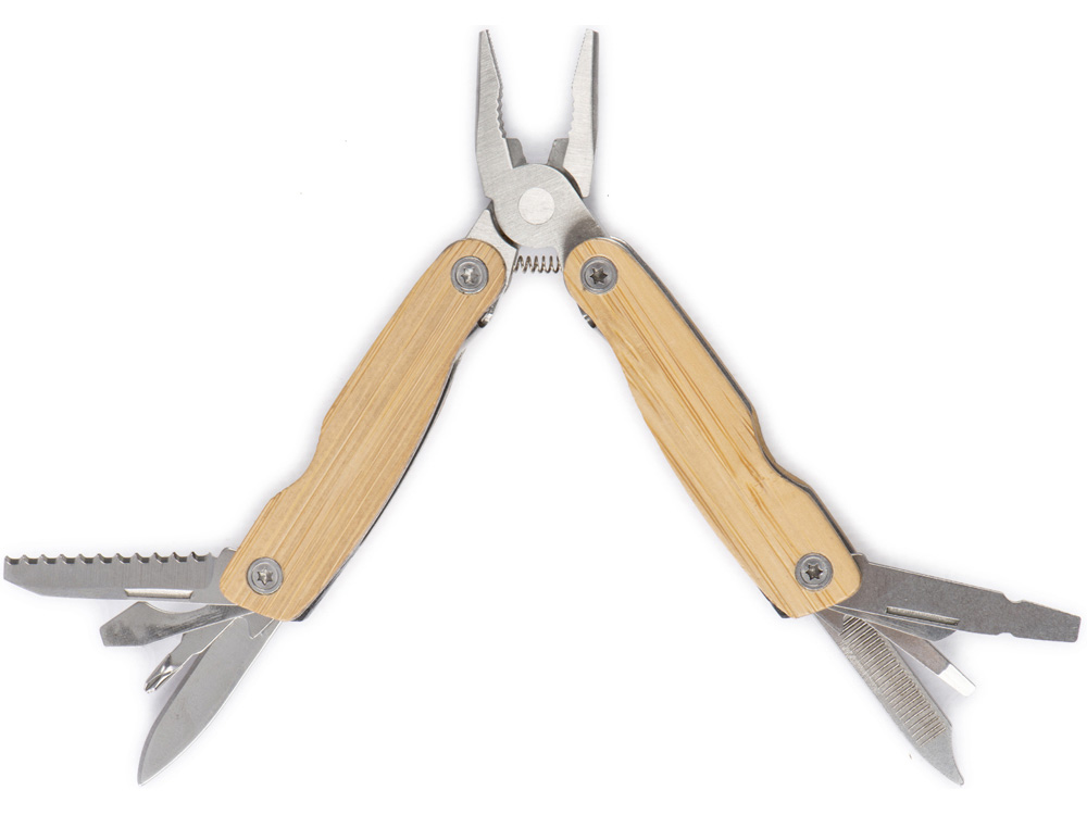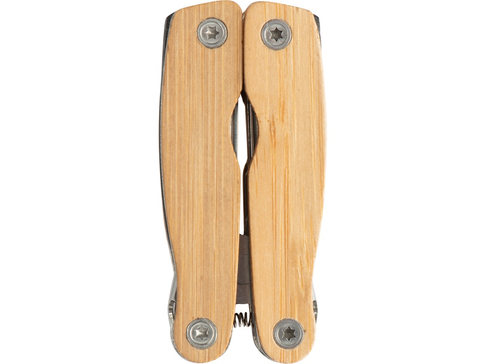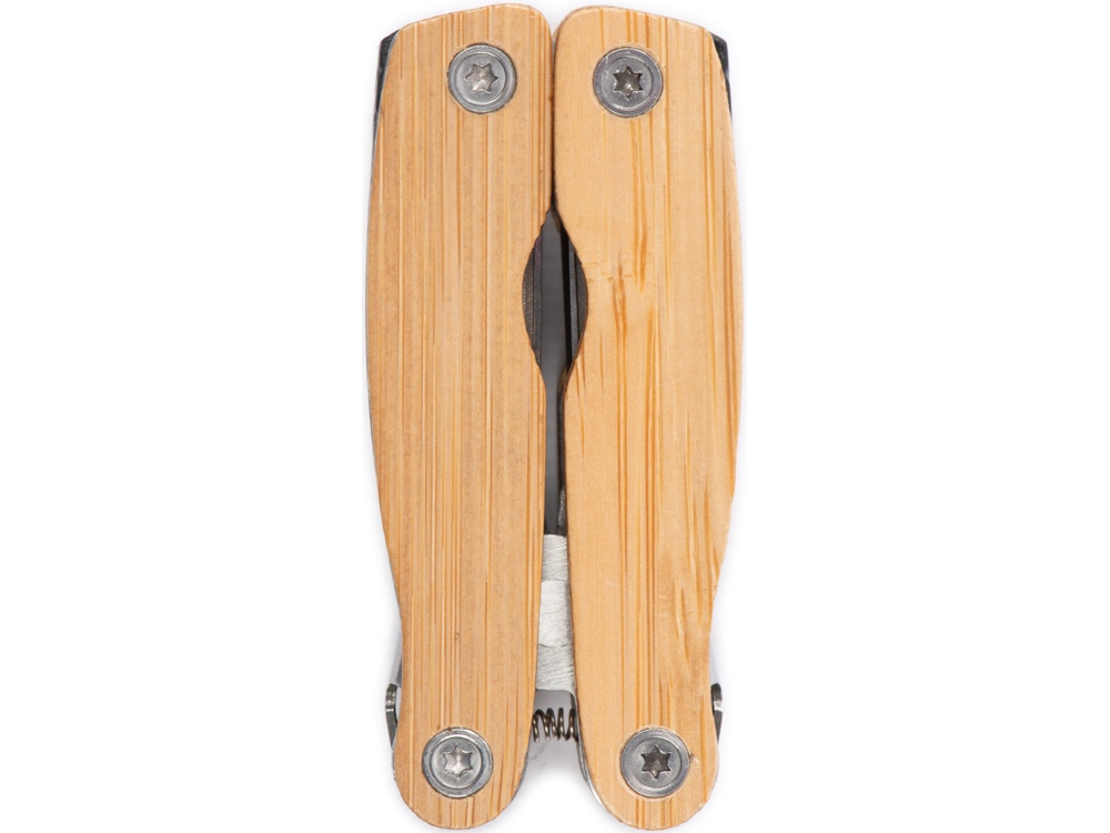 Компактный мультитул на каждый день с корпусом из бамбука. Поставляется в коробочке с чехлом. - плоскогубцы - открывалка для бутылок - крестовая отвертка - нож универсальный - открывалка для банок - плоская отвертка 3 шт. - пила по дереву - напильники по дереву и металлу